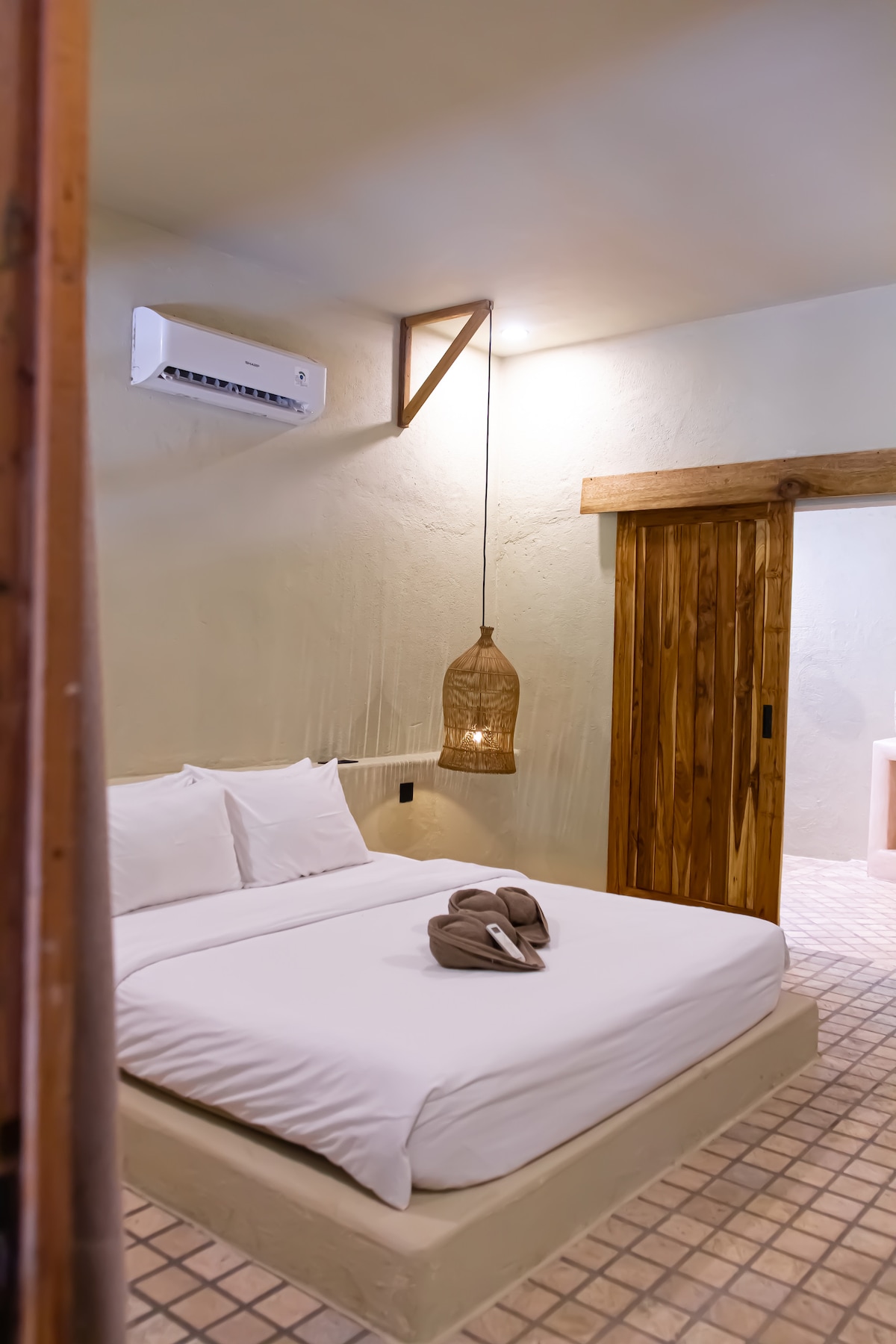 Our boho-style cottages each feature a private indoor bathroom with a walk-in shower, a king-size bed, and a private garden for ultimate relaxation. Enjoy the large pool with bean bags and sun beds, and visit our bar for breakfast (included) or a refreshing drink. The décor is light, cozy, and bohemian, with plenty of cushions for added comfort.