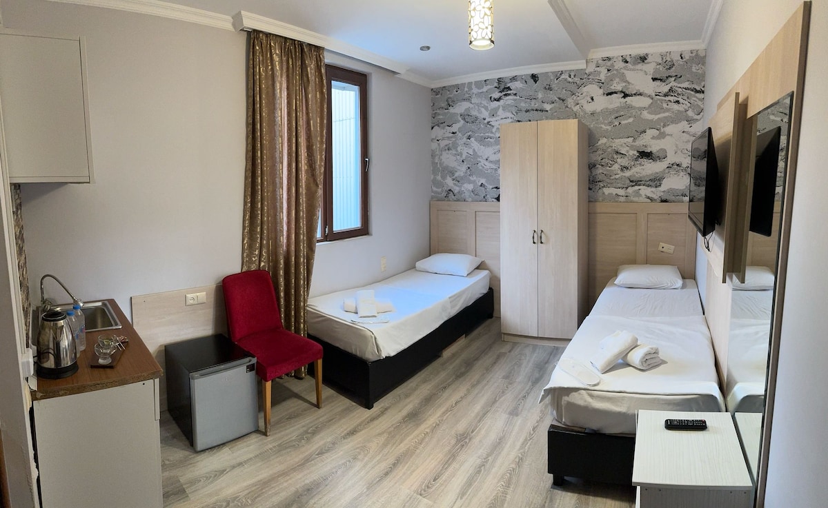 Welcome to Blue Escape – a calm, hotel-style room with balcony and access to a newly built shared drop pool surrounded by nature. Designed in soft blue tones, it’s perfect for solo travelers or couples seeking peace and comfort. Enjoy the fresh air, relax in a cozy bed, and stay connected with Wi-Fi and smart TV. While there’s no kitchen, great cafés are nearby. A quiet retreat just minutes from Batumi’s center.