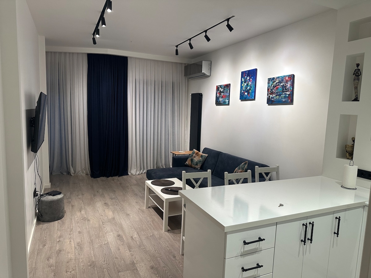 This beautiful contemporary studio flat is just 2 minutes walk from the city's cleanest beach, 5 minutes walk from city central square and all touristic areas, cafes and restaurants. King sized bed with all glass window for nocturnal sky and city gazing. The kitchen is fully equipped with everything you will need. It's wonderfully quiet and secured with high security systems. There is a bike hire station just 20 seconds away, perfect for a cycle along Batumi Boulevard.