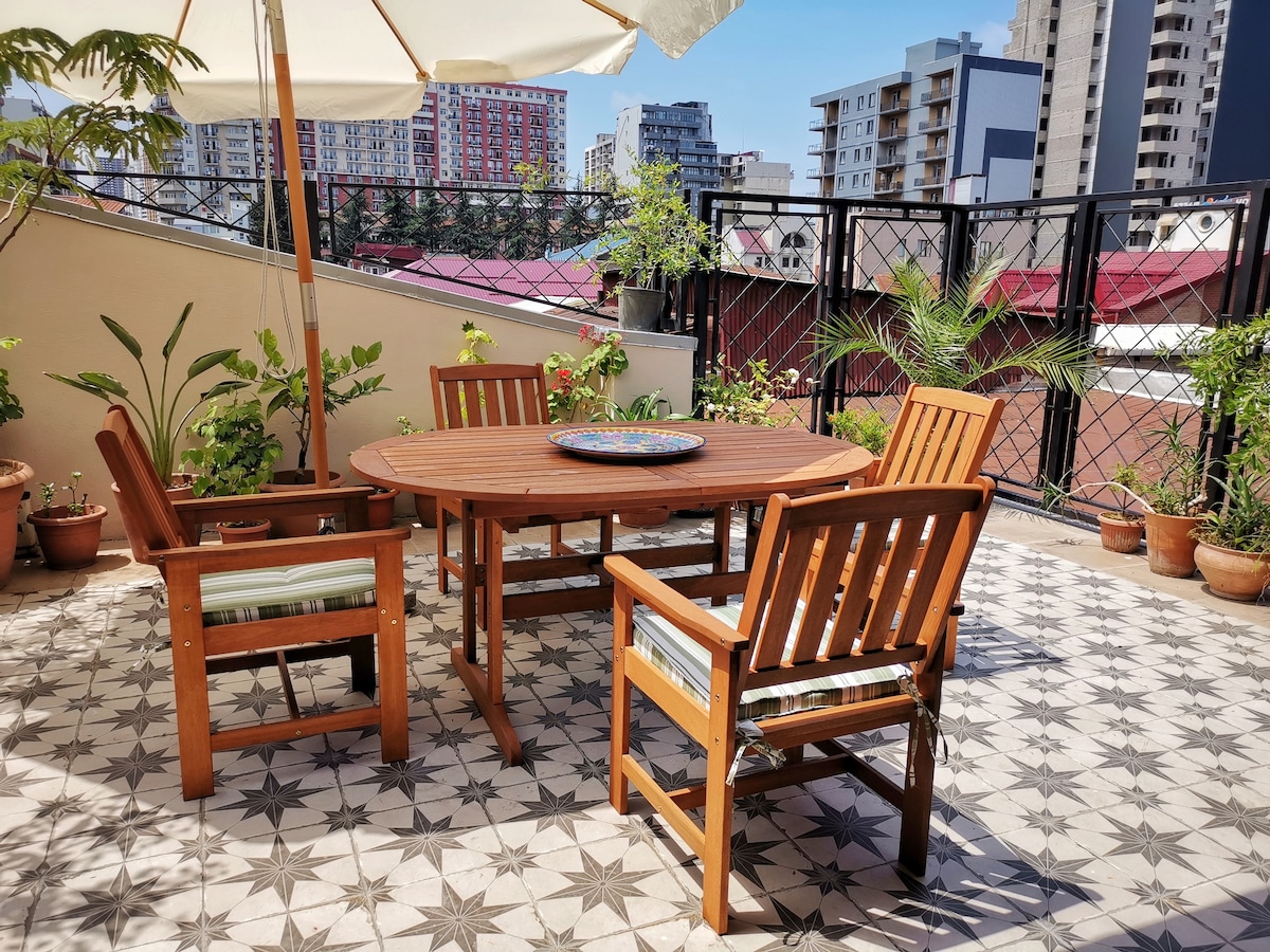 Located on the top floor of a cultural heritage building in central Batumi, this spacious apartment offers a rare 40 m² rooftop veranda with panoramic views of the city. Just 5 minutes from Seaside Park and 7-10 minutes from the beach. Walking distance to Europe Square, Old Batumi, cafés, restaurants, and key attractions. A unique stay that combines historic charm with a prime location. This home offers space for up to 9 guests. Things to note: - No elevator – No parties or loud noise