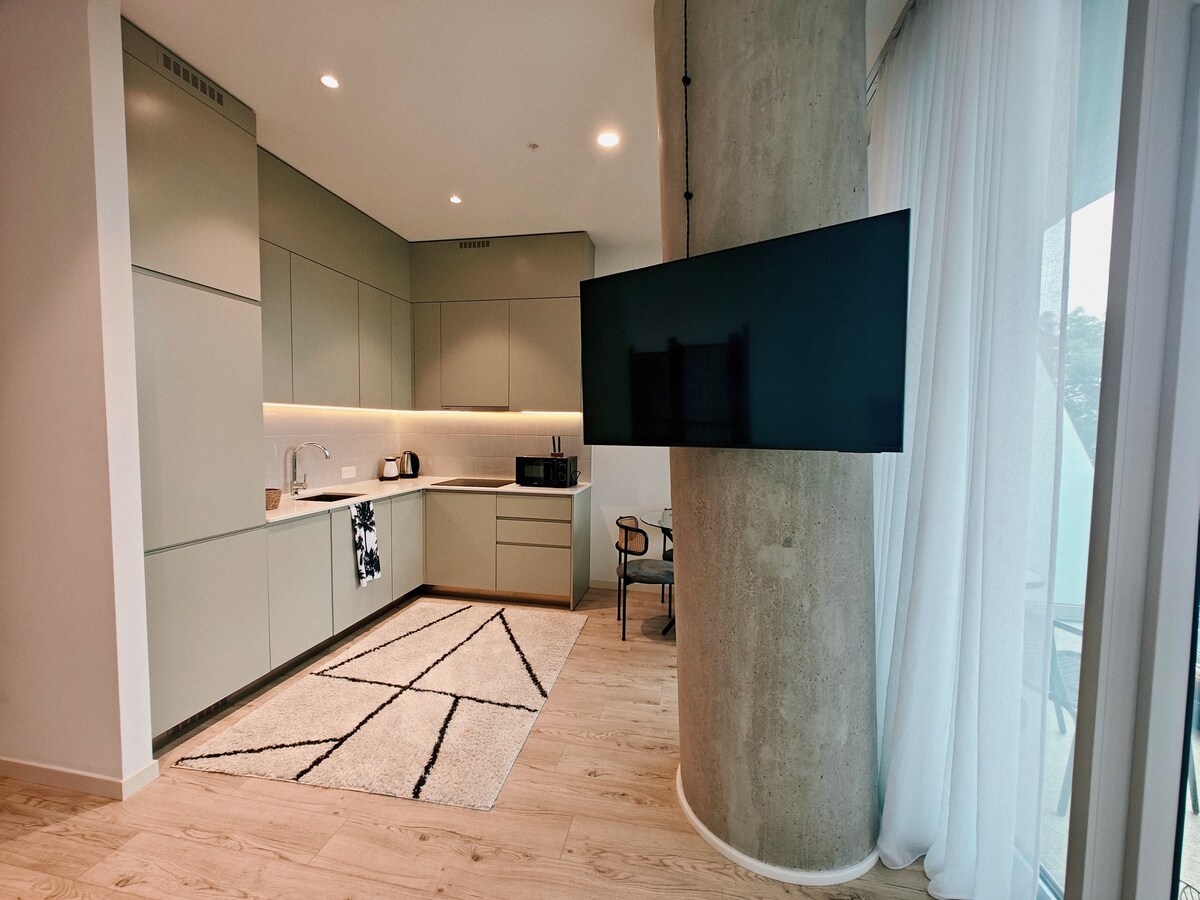 The balcony of this beautiful studio apartment overlooks the Batumi Central Park and is practically on its territory. If you love greenery, a recreational area, a lake, beautiful gardens... this is the ideal place for you. The balcony overlooks the lake. On the fourth floor of a new building, in a studio-type apartment, there is everything for a couple to comfortably relax. Most importantly, the apartment has a balcony, and you can walk to the beach in a few minutes, passing through the lake.