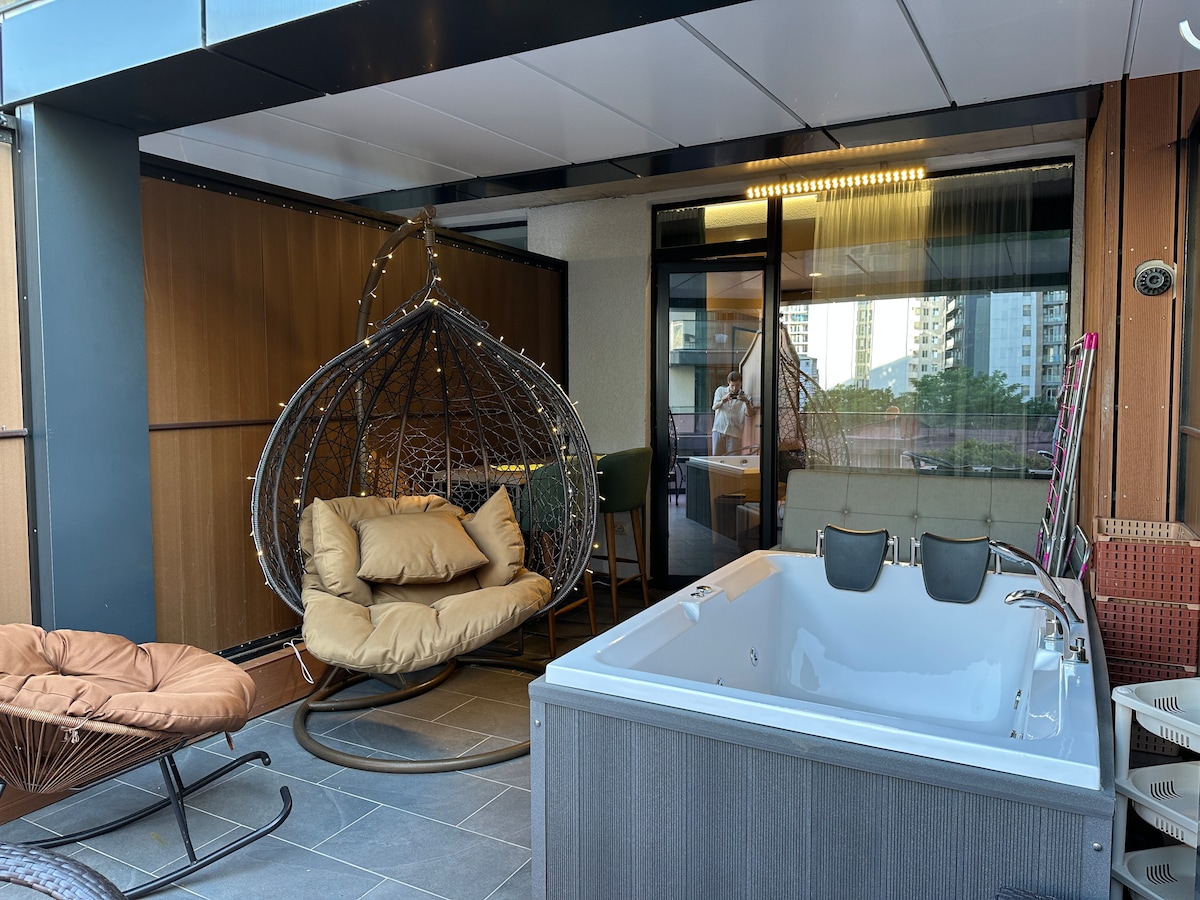 Welcome to the ART apartment with a unique atmosphere! Luxury, style, and art — all in one place! A jacuzzi on the balcony with views of the city and mountains, surrounded by tropical plants, creates a secluded paradise. The rock-shaped bed, crafted by sculptors, is one of a kind, complemented by a stunning 4x2 meter mural. The dark tones of the interior set a romantic mood. Just 200 meters to the beach, and 100 meters to the mall! Perfect for relaxation and inspiration.