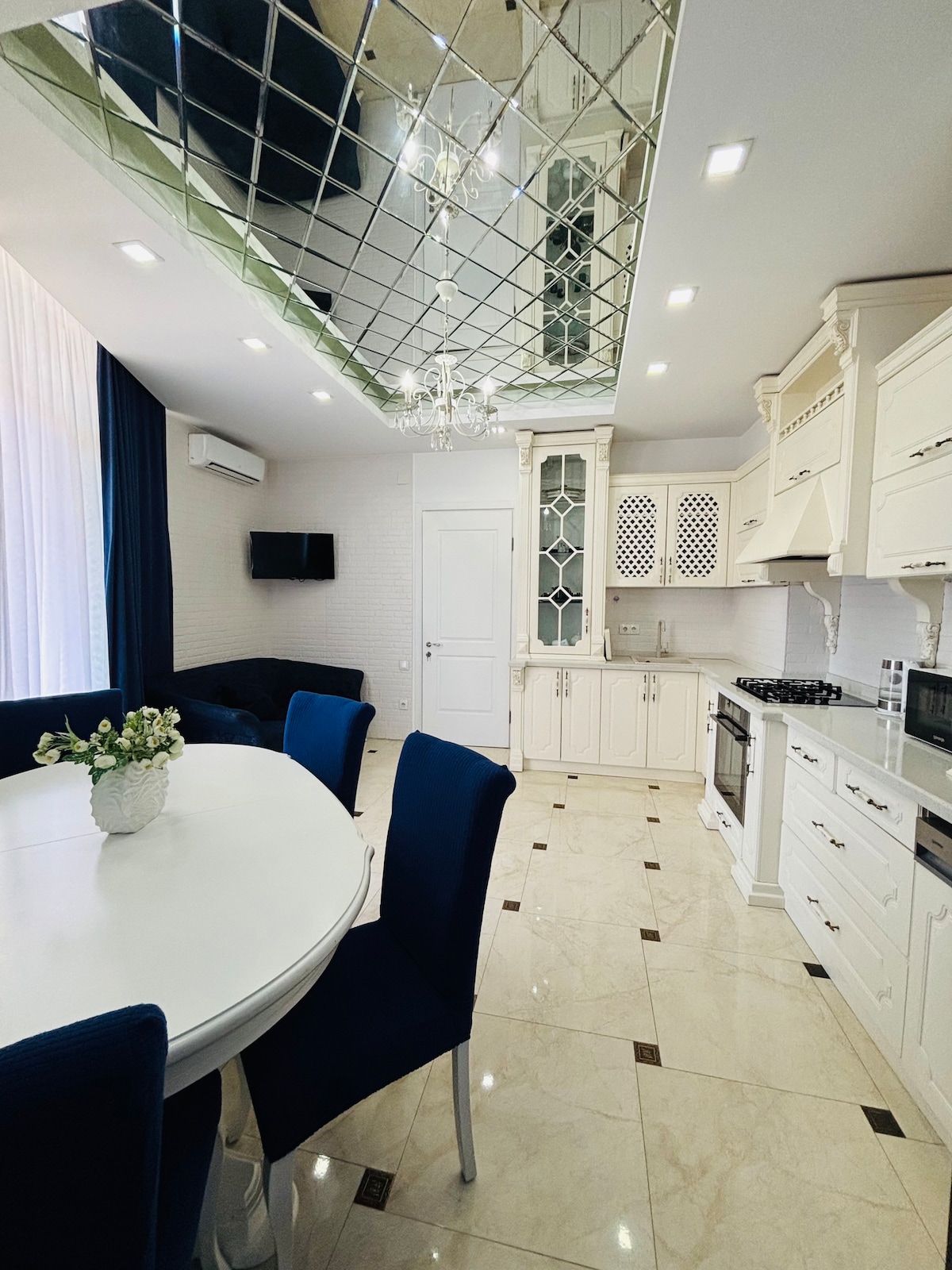 Alliance Palace VIP Apartment is located on the first line, 100 meters from the beach, with a beautiful view of the singing fountains and the building of justice. It offers free Wi-Fi, a 24-hour front desk, many restaurants and bars nearby, and 2 hypermarkets. The room has air conditioning, flat-screen satellite TV, washing machine, microwave, refrigerator, kettle, hairdryer, mosquito net, wardrobe, large balcony, private kitchenette and bathroom.