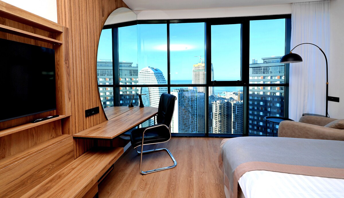 Панорамный вид, высота окон 5 метров, современный ремонт, высококлассная мебель и техника. Все это будет сопровождать Вас во время отдыха в Батуми. Каждый день Вы будете просыпаться с ошеломляющим видом на море непосредственно с кровати. Вы будете выпивать утренний кофе в компании с ласковым морем. А вечером, с друзьями Вы будете встречать закат, находясь на большом диване, с комфортом и с бокалом грузинского вина в руке. Эти апартаменты откроют Вам новый вид отдыха. Почувствуйте "Вид на Море".