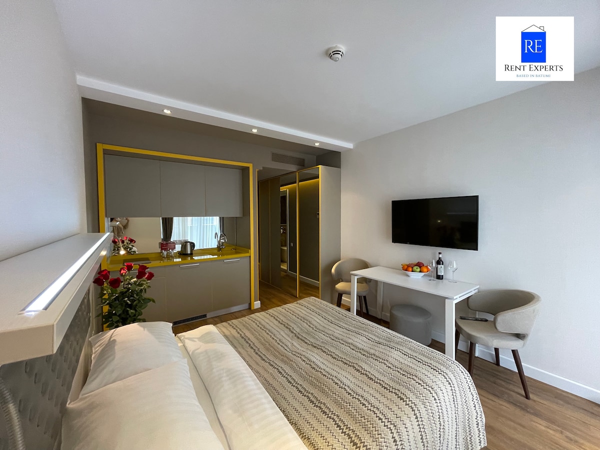 Modern spacious premium studio on the 17th floor with stunning views of the sea, park, mountains and pool. The apartment has everything you need for a comfortable stay: dishwasher, capsule coffee maker, washing machine, toaster, microwave, etc. The apartment is located in the best complex in Batumi with a large territory, swimming pool, sports and playground in the courtyard, restaurants and a shop. Near the shopping center, casino, sea and park. The airport is 5 minutes away by taxi.