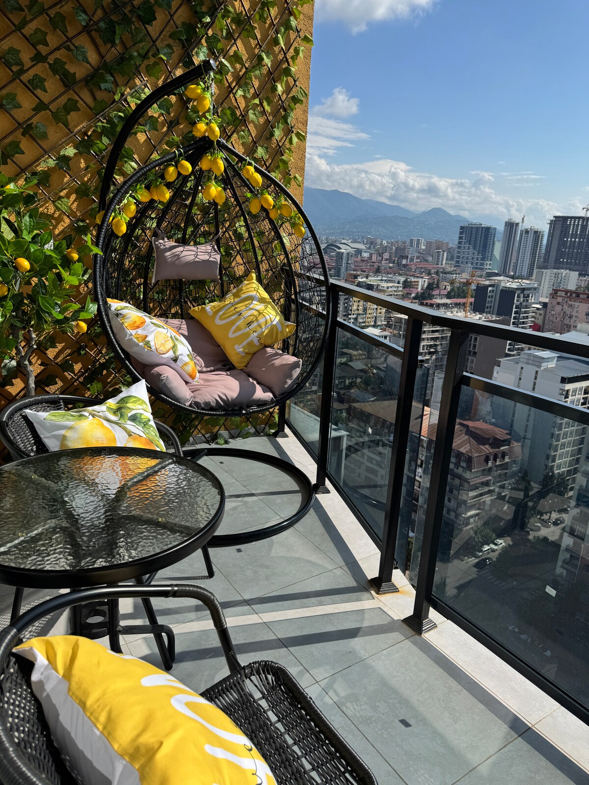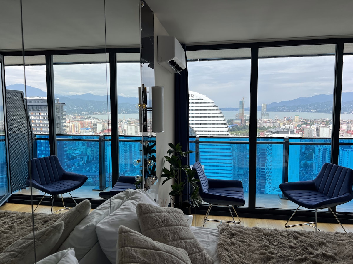 Насладитесь стильным отдыхом в центре города. Новый дом , высокий этаж в центре города с прекрасным видом на снежные горы , море , город . В низу расположены самые ТОПовые рестораны Аджарии .Квартира светлая с панорамными окнами , большим балконом с уютной зоной отдыха где можно видеть самые красивые закаты Батуми .