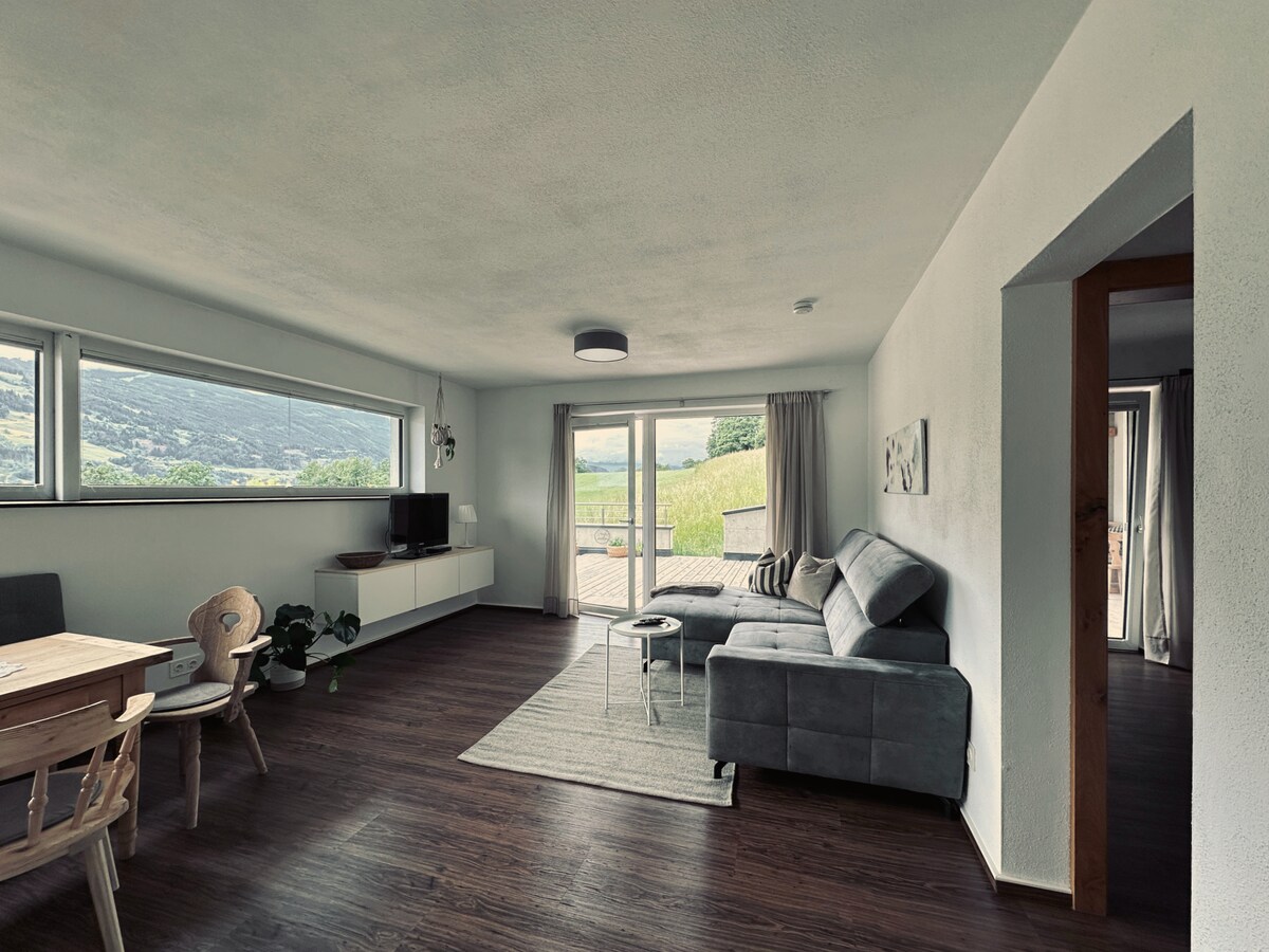 Situated on the outskirts of a Tyrolian mountain village this place offers you a wonderful-broad view. The apartment, lovingly combining tradition and modernity will let you calm down and recharge your batteries instantly. A closeby cable car enables you to all kinds of mountain sports in summer and winter. Yet- even those, who just "stay and relax" will feel at home. WIFI, TV, BT-boxes, parking space are available free of charge; for the Sauna we take a small feey. Kitchen is well equipped .