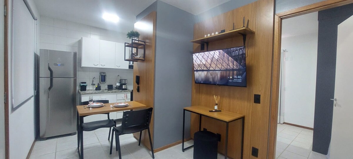 Cerque-se de estilo neste espaço excepcional. Acomoda até 4 pessoas! Totalmente mobiliado! Novo! Ar condicionado! Sacada com vista para o aeroporto. Ao lado do Shopping e Supermercado! Restaurantes e Barzinhos! Ficaremos muito felizes em hospedar vc! Cama de casal Box e sofá cama confortável! O prédio conta com piscina, salao de festas e churrasqueira, Co working, lavanderia, mini mercado, espaço pet, academia e estacionamento gratuito (1vaga).