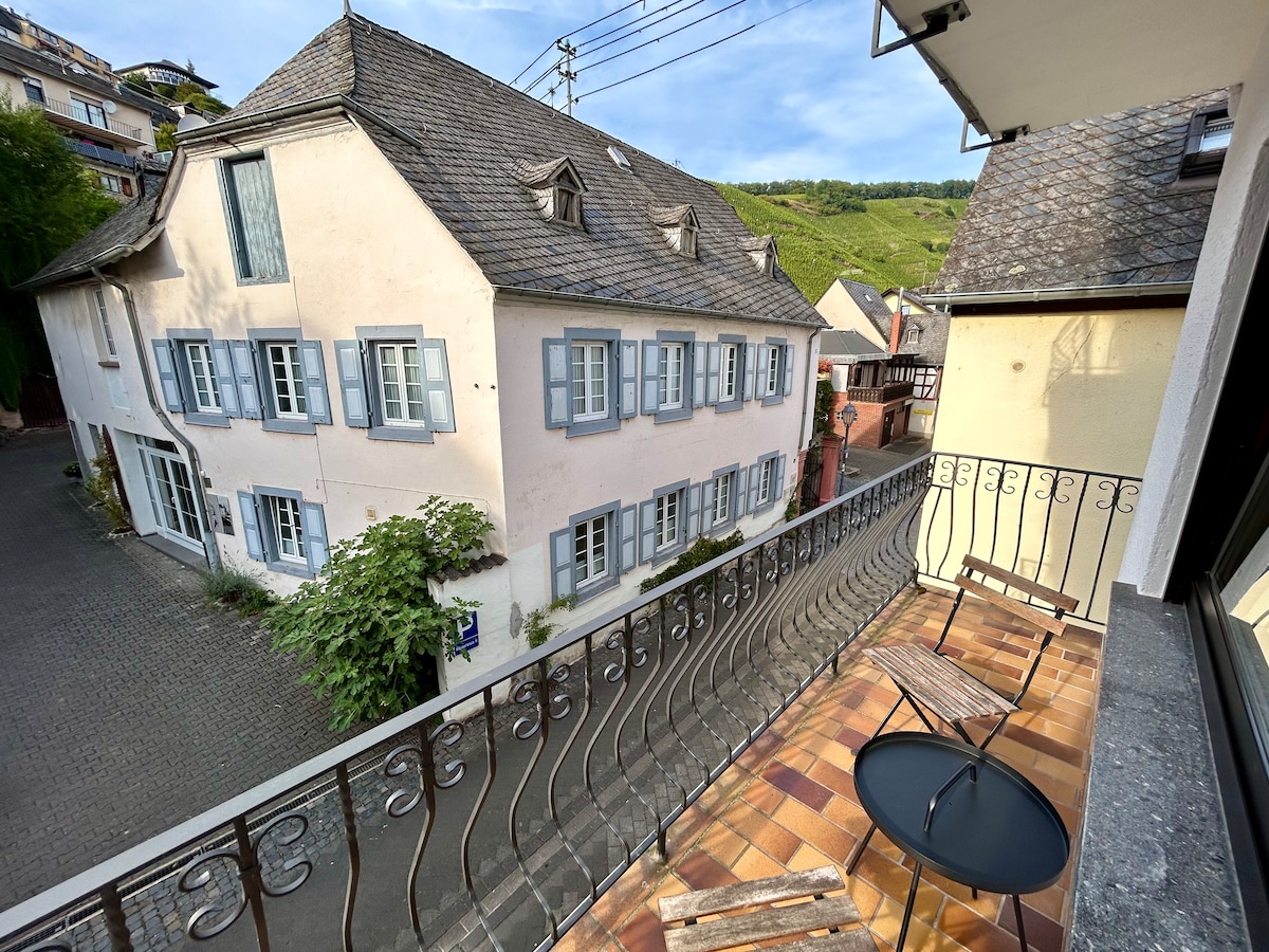 Vollausgestattete Ferienwohnung im historischen Ortskern. Die Wohnung bietet ein Schlafzimmer, ein Wohnzimmer (mit ausziehbarer Schlafcouch, 1,4m*2m Liegefläche), Bad sowie eine vollausgestattete Küche. Darüber hinaus bietet die Wohnung einen Balkon mit Blick in die steilen Weinberge des "Ürziger Würzgarten". Weingüter haben ihre Türen für Weinproben geöffnet. Das Moselufer ist nur ein paar Schritte entfernt.