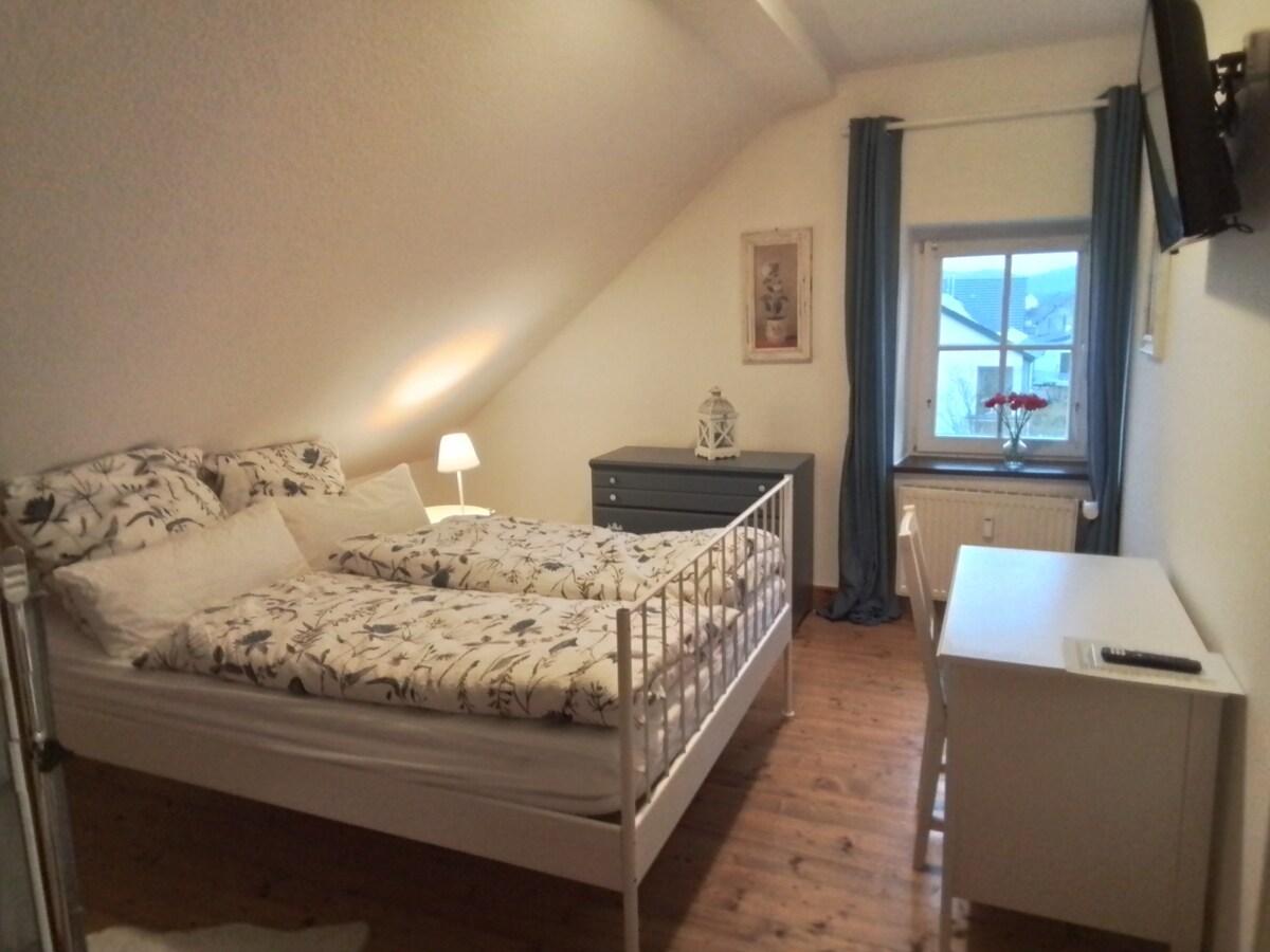 Beautifully furnished double room with own shower bath. TV via streaming stick. Bed 140/200, oversize bedding 155/220. Kitchenette with fridge, microwave, coffee maker and kettle. Room is located in completely private guest area of the house. Central station, A1, A60 very close. Mosel, Eifel and Hunsrück can be reached quickly. Ideal starting point for hikes and discovery tours. Free parking available in the street. Free fast WiFi.