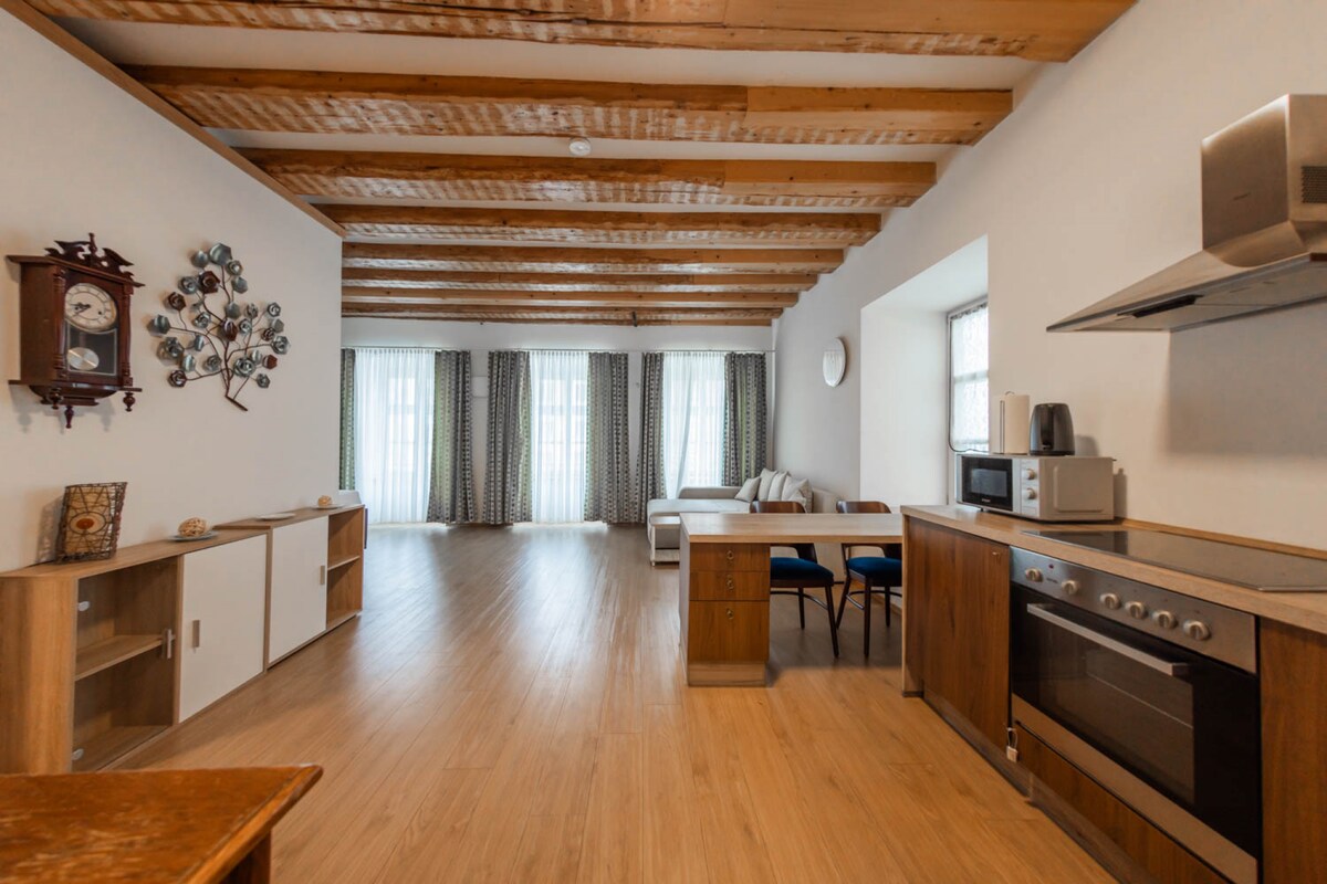 Unsere 4 Komfort Apartments sind 43m2-52m2 groß und überzeugen mit einer modernen und stilvollen Ausstattung, die eine elegante Rückzugsmöglichkeit in der Stadt bieten. Genießen Sie den Luxus von Privatsphäre, Geräumigkeit und einem Ort zum Entspannen. Die Apartments verfügen über ein geräumiges Schlafzimmer mit einem King-Bett (180x200) sowie voll ausgestattete Wohnküche, einen offenen Wohn- und Essbereich und einen großzügigen Eingangsbereich.