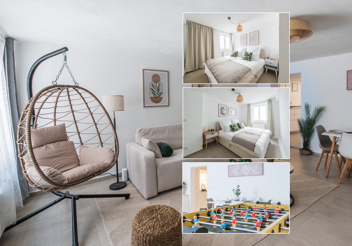 Experience comfort and entertainment in this centrally located, accessible accommodation: Foosball table and projector for fun and movie nights. Two box-spring beds (180x200 & 160x200) plus a sofa bed. Fully equipped kitchen and rain shower. Wi-Fi and 24/7 check-in for maximum flexibility. Super central location near Königsplatz and Maximilianstraße. Perfect for up to 6 people – whether family, friends, or business travelers.