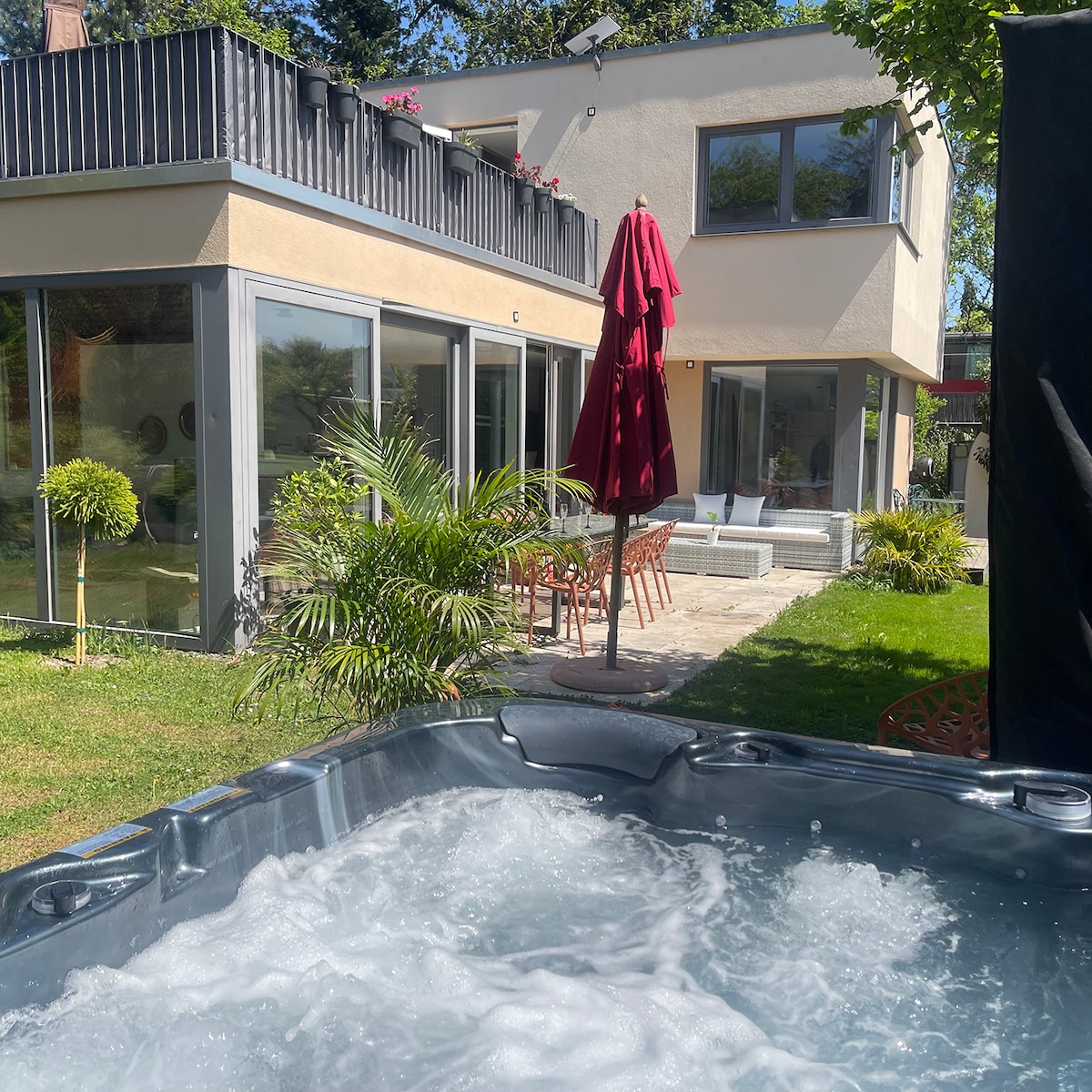 Corona free and well disinfected! Enjoy a peaceful stay in our idyllic house with large garden, trampoline, outside sauna & private lake, 20km south of Munich. The house has 4 bedrooms, a whirlpool, a well equipped kitchen, a games room, a living room with fireplace, large sofas & TV. There are 3 showers in total and two bathrooms. We want to provide a safe retreat and a home away from home in these crazy times. We will always disinfect the house thoroughly!