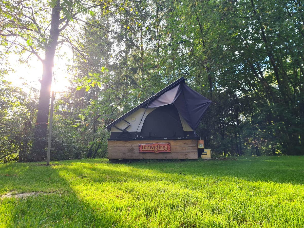 Schlafe in einem unserer Qeedo-Dachzelte und genieße den Ausblick auf Feld, Wald und Wiese oder durch das Dachfenster in den Sternenhimmel. Unsere Zelte sind auf einer großzügigen Holzplattform montiert. Zwei Liegestühle und ein Frühstückstisch sind inklusive. Auch ist bereits eine Matratze drin und ein frischens Laken erhaltet Ihr beim Check-In. Ihr nutzt das moderne Sanitärgebäude mit den anderen Gästen des Kornberg-Borderland-Campingplatzes. Duschen kostet 0,10€ je 20Sek. Wlan gibt's gratis!