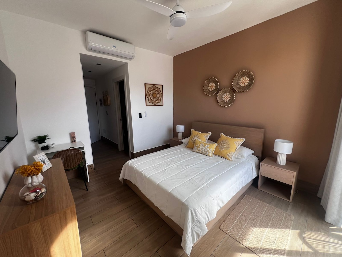 El apartamento es ideal para 2 adultos y 1 niño. Todo el equipamiento es nuevo: cama tamaño queen, sofácama en la sala para 1 niño o adolescente, smart tv, wifi/40 mbps, comedor, amplia cocina, un baño cómodo y espacioso, closet, caja fuerte, terraza muy cerca de la piscina. Está en la zona turística más dinámica de Punta Cana a 500 metros de la playa. Hay gran variedad de restaurantes, casas de cambio y comercios. El consumo eléctrico lo paga el cliente (0,4 US$/kwh).