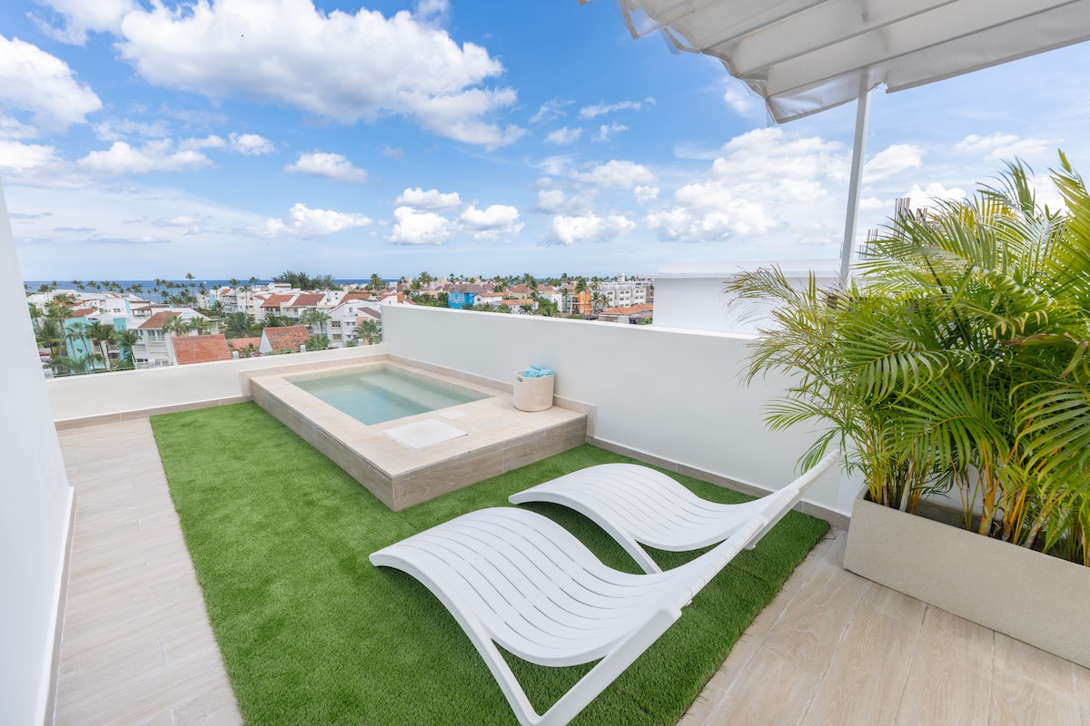 A solo 10 minutos caminando te esperan las famosas playas turquesas de P.Cana Nuestro Penthouse de 2 niveles, tiene un diseño moderno un amplio salón con cocina equipada, un dormitorio con cama King size y un baño. La verdadera joya es nuestro rooftop, donde encontrarás un Oasis con zona de BBQ, Jacuzzi privado y lounge con tumbonas, definitivamente un lugar donde vivirás algún momento inolvidable! -EL JACUZZI NO ES DE AGUA CALIENTE. -PUEDE HABER RUIDO DE CONTRUCCION CERCANA ENTRE SEMANA