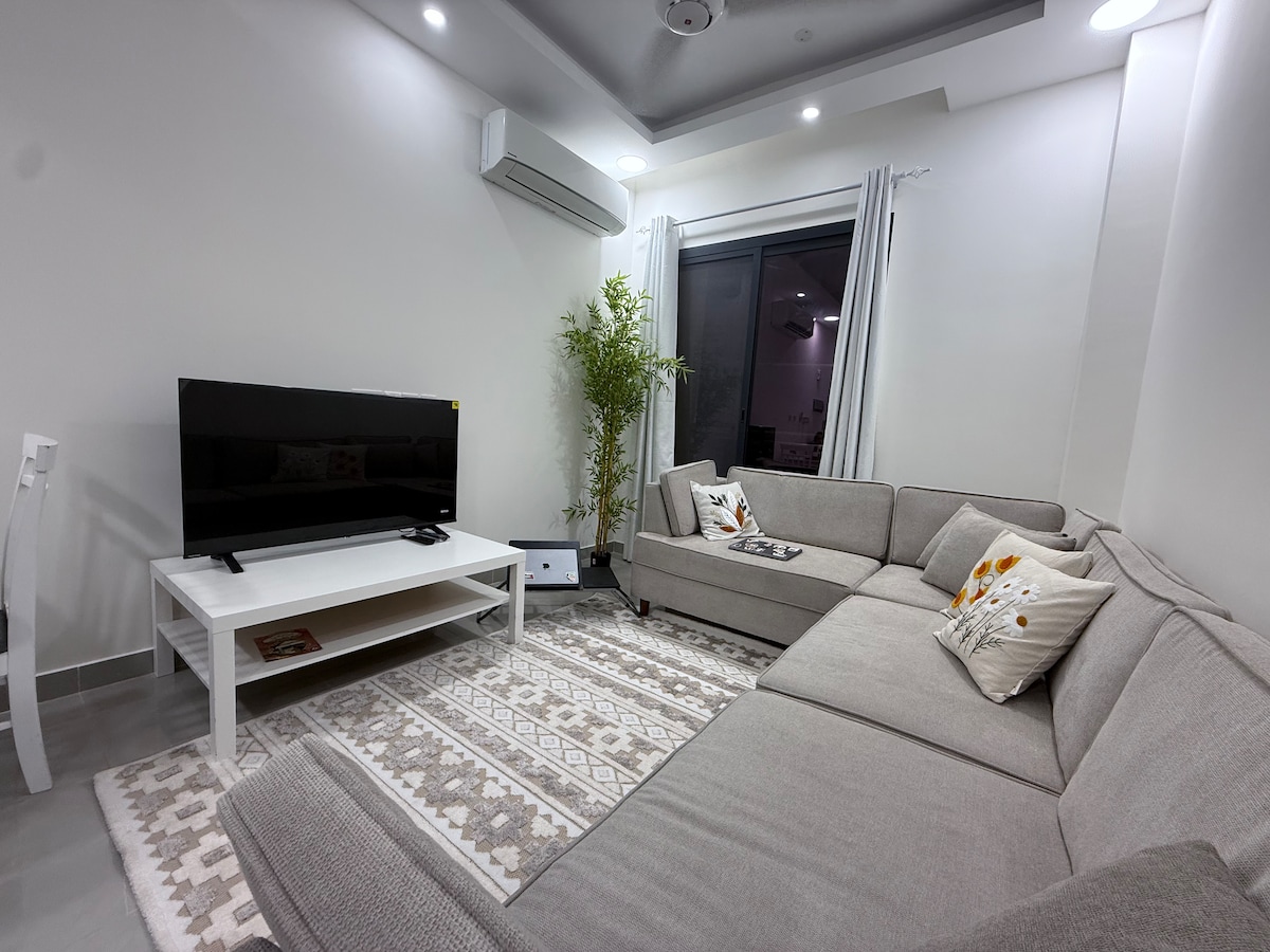 New 1 Bd flat with balcony, living area & 2 toilets.Nice furniture. Equipped with high speed WiFi, bed and dressing,sofa, 50 inch smart TV, satellite and free Netflix access, iron machine, hair dryer,vacuum cleaner, duct AC, ceiling with LED spot lights . You can enjoy the free swimming pool, gym & kids playground and BBQ cooking area. 5min drive from shopping malls, 15-20min from airport. 20min drive from beach, 20min drive from the old Market, next to sand dunes view.