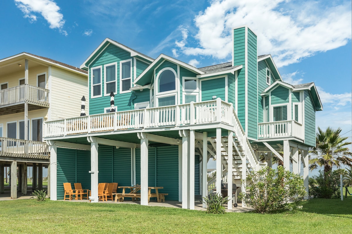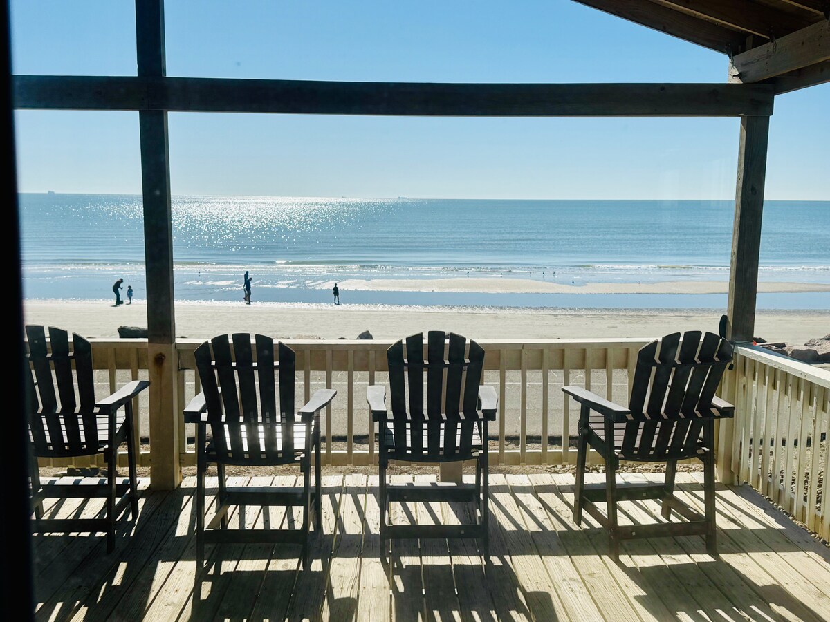 NEW Beachfront Construction! Truly a Unicorn:🦄 LOCATION, LUXURY, and So Nice to Have NEW! Located steps away from the best restaurants and beach in Surfside! Enjoy hammocks and games under the house. Climb the steps to an awesome shaded deck with views from San Luis Pass all the way to the Jetty! More than 180 degree unobstructed views. Bedrooms open to SunDeck and stargazing with fire 🔥 pit YouTube Beachfront Luxe for video $125 cleaning fee and only $75 total for up to 2 pets for whole stay!