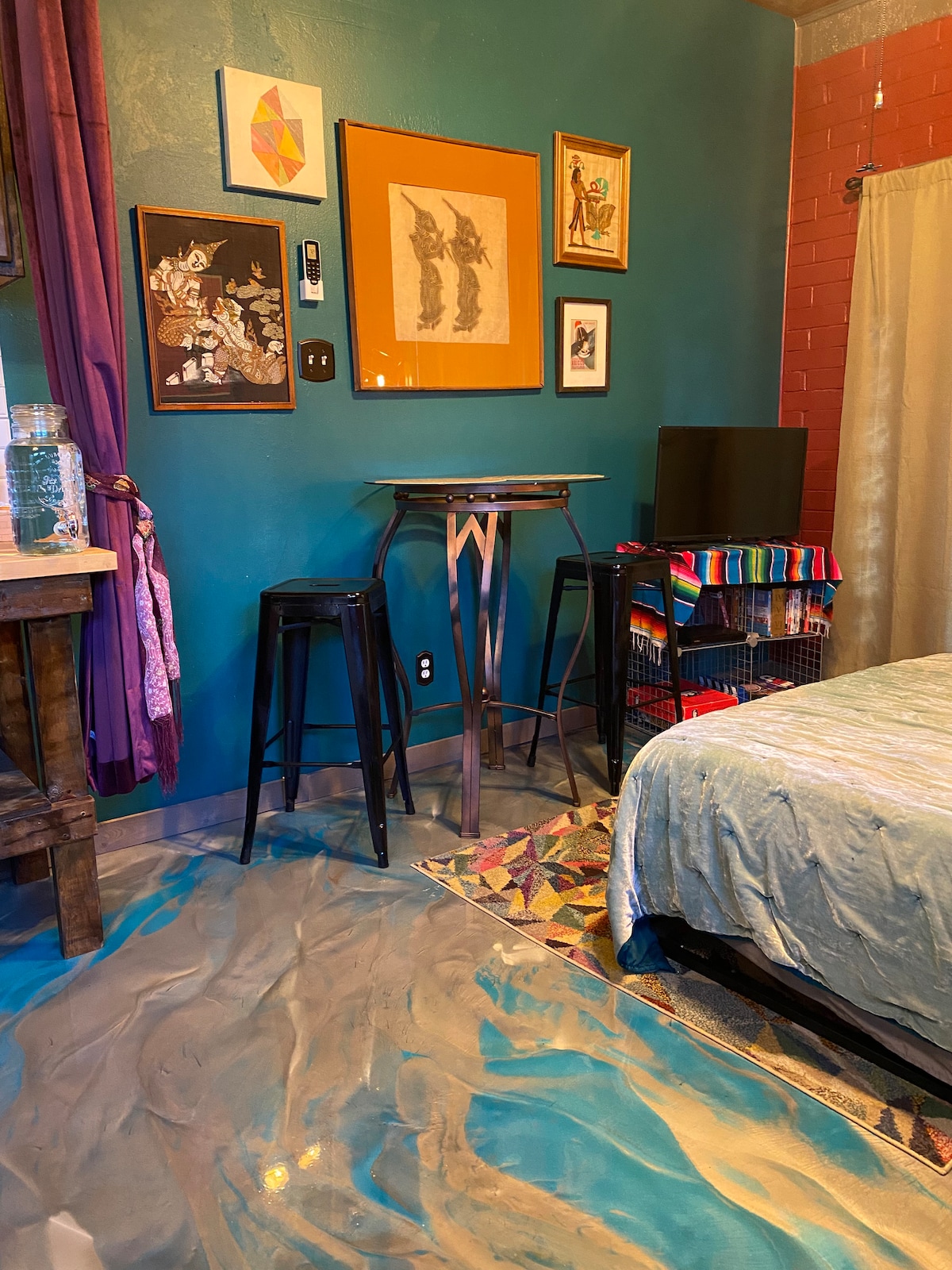 Please note the step up to the bathroom and ONE low bed. Some guests have trouble with these! The futon folds down into a twin size bed. If you have one kid (or two small ones) they may be comfy sleeping here. Let me know and I’ll make it up for you before you arrive. You will not be able to add them to the reservation but just text me! Private entrance to a renovated single car garage apartment in the popular, quiet Cove neighborhood.