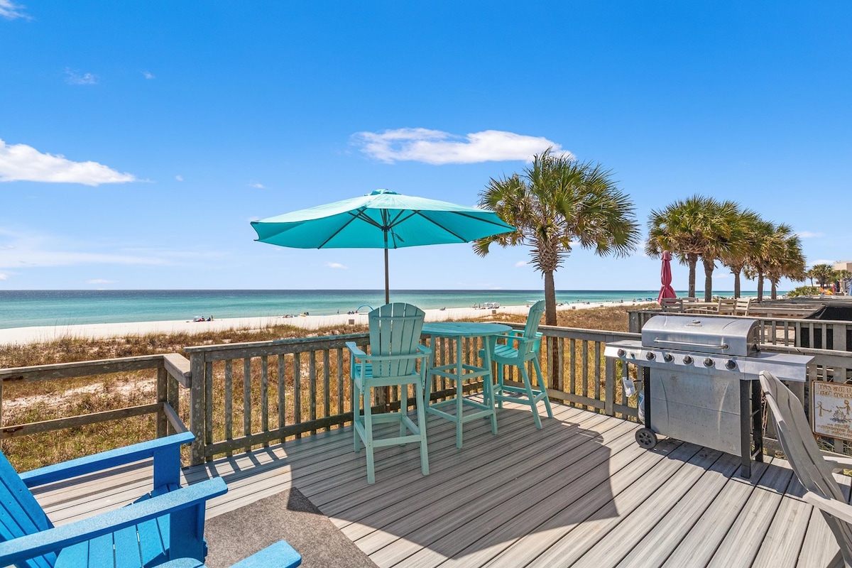 Perfect family getaway! This cozy beach cottage is just a 3-minute walk to the white-sand beach and emerald Gulf waters. Recently renovated, it features a welcoming main level with kitchen and living area opening to a covered porch and outdoor living space. Upstairs are two bedrooms and two full baths—one with a king, one with two queens—each with balcony access. Private parking spaces included.