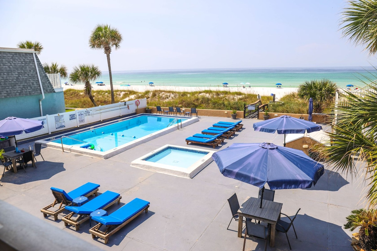 FREE BEACH CHAIRS/UMBRELLA (March 15 to October 31, 2026). The Complex was renovated in March 2026 and the Studio has been remodeled. We are DIRECTLY on the beach in beautiful PCB! The room has a King bed, sofa, and recliner. Private balcony and features a full kitchen and appliances. Bathroom has a beautiful walk-in shower. Within walking distance to Pier Park and many restaurants. New 2024 laundry facilities on property (visa/coin operated). We have a Beachside café and heated pool!