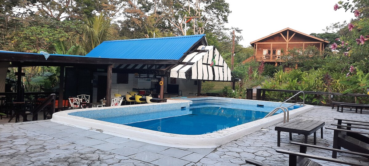 Guava Grove Small Hotel. Clean Queen Bedroom Kitchenette Studio with sitting area w/ Private Bathroom hot water shower. Large Pool with lounge chairs and restrooms in common area. Free Parking. Air conditioning is available (+$10/night), Fiber Optic Wifi. Main floor unit in wooden building. Small Balcony with outside table and chairs. This end unit affords privacy with no one passing in front of your door. Common area pool with loungers, shade and restrooms.