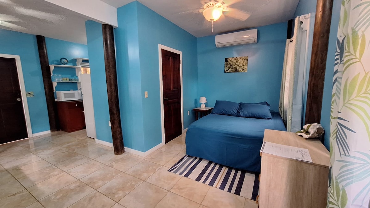 Studio conveniently located in an attractive, safe, residential community between West End and West Bay. Accessible by car, water taxi, & beach. Only 70 meters from uncrowded Turtle Beach, Clearwater Adventures - Roatan's top dive shop, The Boat Bar & several high-end bars/dining - all a 5-min walk on the beach! Snorkel & swim steps from shore. Comfortable room with a view of nature. WiFi, cable TV, AC, and free Roatan Disc Golf.