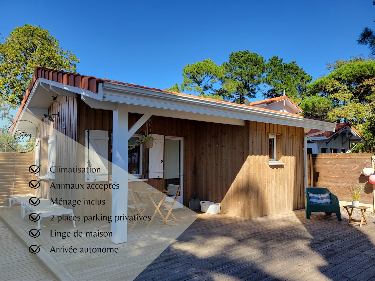 Welcome to Ohana. At high or low tide, come and take advantage of “Le Bassin”. In a beautiful 500 square yards enclosed garden planted with trees, a lovely 50 square yards air-conditioned holiday house, which will offer you a relaxing stay for successful family holiday. A little hot tub is available. Located alongside the cycle track and the road that lead to the oyster-farming harbour (seashore at 1,2 Mile, Atlantique Ocean 12 Mi), it was built by a local and ecological company. New furniture.