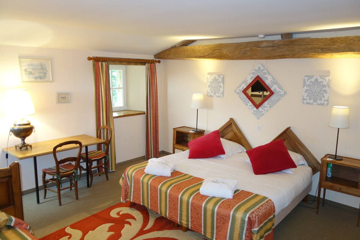 Le studio, comprenant chambre ( lits faits), salle d'eau (douche et lavabo, serviettes fournies), kitchenette (plaques électrique et four à micro onde) et WC, se situe au premier étage d'un château (15 et 18 ème siècle) dans un environnement fleuri et arboré, au calme, à 1 km du bourg par une allée forestière privée. Vous pouvez, par l'annonce "séjour au château", bénéficier de 2 chambres. (voir l'annonce sur Airbnb)