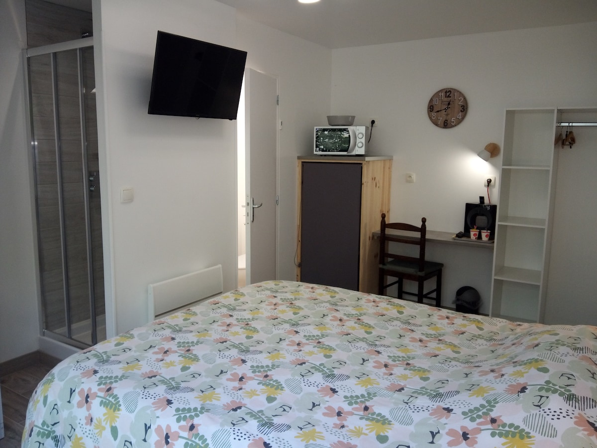 Belle chambre indépendante comprenant lit double queen size 160 x 200, salle d'eau accolée, WC indépendant, coin bureau avec micro-ondes / mini réfrigérateur. En extérieur, une terrasse avec table, chaises. Stationnement gratuit et fermé sur la propriété. Cette chambre est situé à 10/15 minutes de Saint Jean de Monts en voiture ; 45 minutes de Nantes et 30 minutes de La Roche sur Yon.