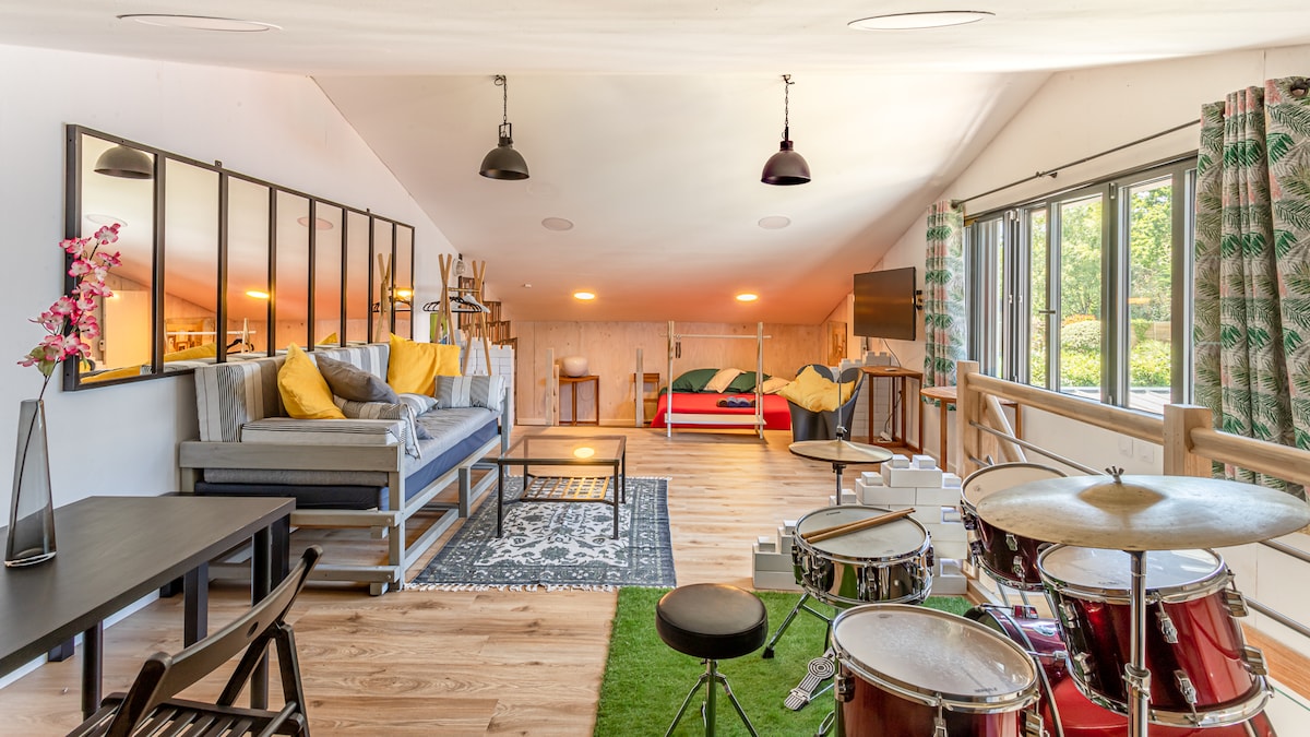 Aimez-vous un peu, beaucoup, passionnément... à la folie ! Évadez-vous à 2 le temps d'une nuit d'amour dans notre loft atypique. Détendez-vous dans le jacuzzi, prélassez-vous sous la douche XXL, éveillez vos sens dans le coin coquin et oubliez-vous dans le confort d'un lit 160x190. Offrez-vous ce qu'il y a de plus précieux : du bon temps. Tout le nécessaire au bon déroulement de votre séjour est déjà sur place, vous n'aurez qu'à profiter du moment présent. À 45 minutes de Nantes.