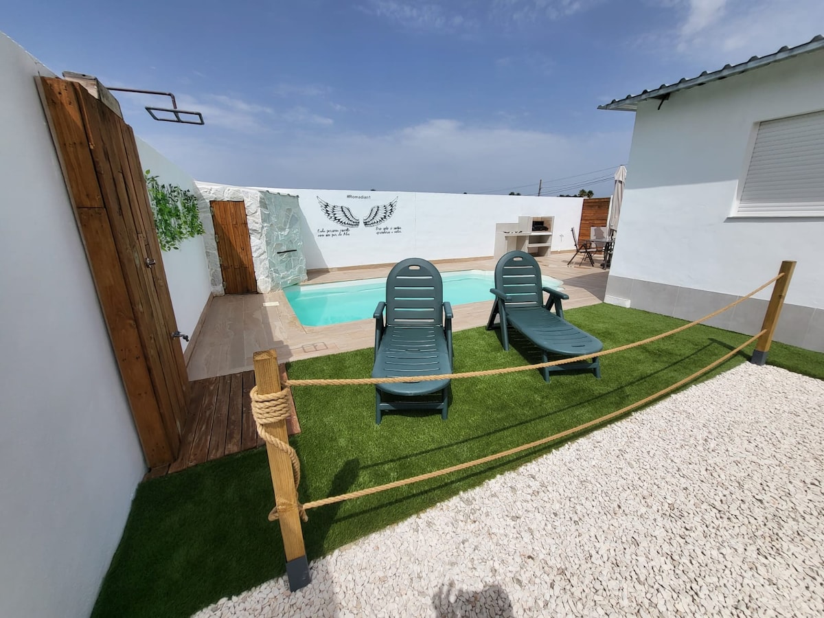 Espectacular alojamiento de diseño elegante.En parcela independiente de 500 metros,con dormitorio de matrimonio, amplio salón-cocina con grandes ventanales hacia la piscina, cuarto de baño y buhardilla con dos camas de matrimonios, una de ellas con ventana en el techo donde poder ver el cielo estrellado en la noche. Domotizada, alexa, Internet..Piscina con cascada y cuello de cisne. Baño externo junto a la piscina y ducha. Rocodromo. Situado en el Pinar del Edén y cerca de playas