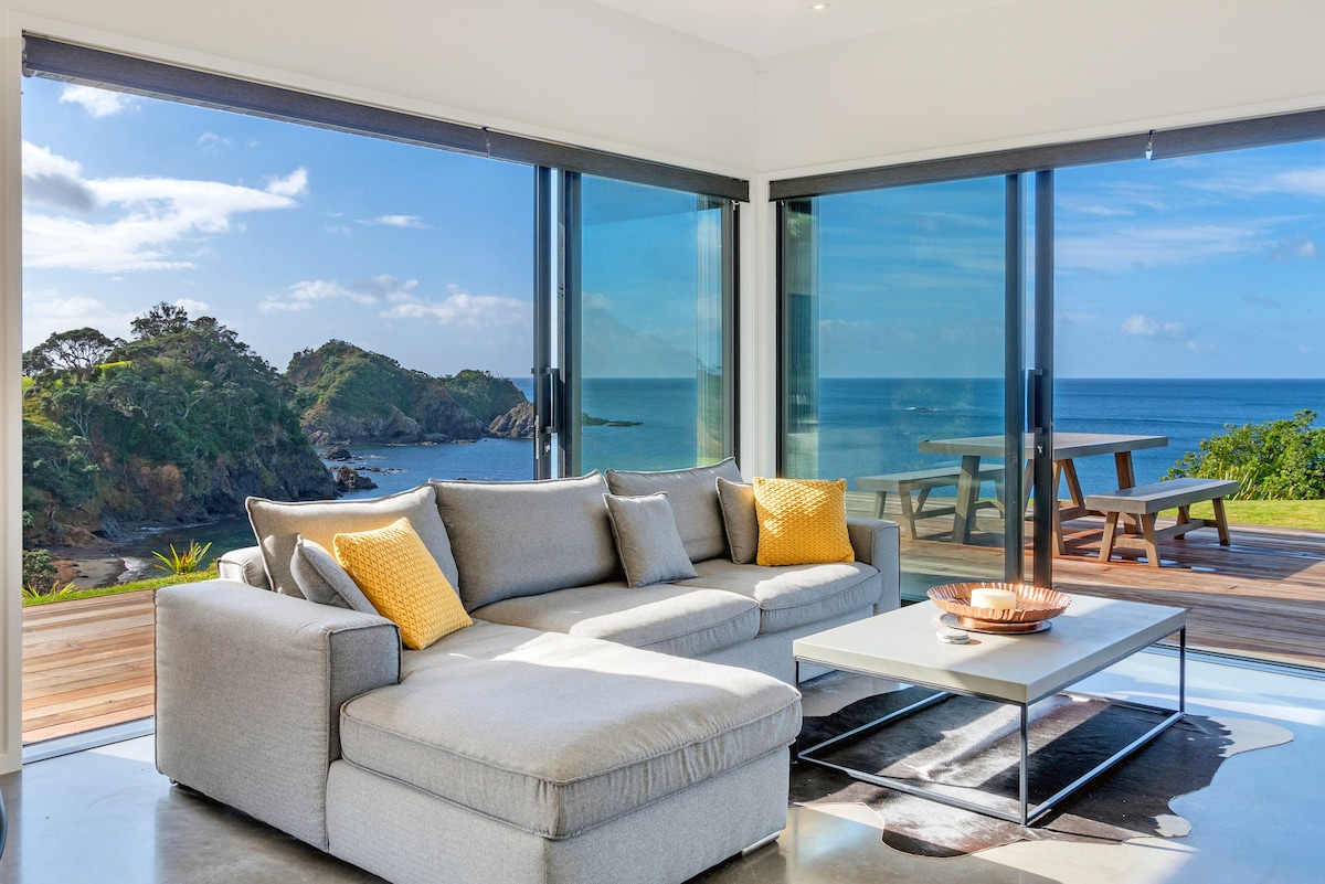 Modern cedar home in Dolphin Bay, Tutukaka with all the modern benefits including a separate self contained sleep out. Absolute water front with panoramic ocean views and access to the beach below for fishing, snorkeling, kayaking, exploring, or just sitting on the sand. Enjoy all day sun from the ocean facing decks and then retire to the courtyard in the evening for a BBQ while sitting in front of an open wood fire. Tutukaka's finest restaurants and bars only a 3 minute drive away