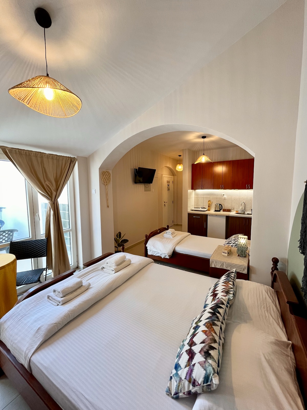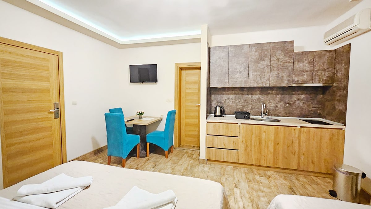 Comfortable and Well-Equipped Rooms for a Relaxing Stay! Our hotel offers three different room types to suit every need: a standard room, a triple room, and a spacious 1+1 family suite. Each of our rooms is designed with a modern and functional touch, ensuring a comfortable stay. All rooms are equipped with air conditioning, free Wi-Fi, a private shower area, a hairdryer, and ample storage space. Additionally, every room features a kitchen, allowing you to prepare your own meals with ease.