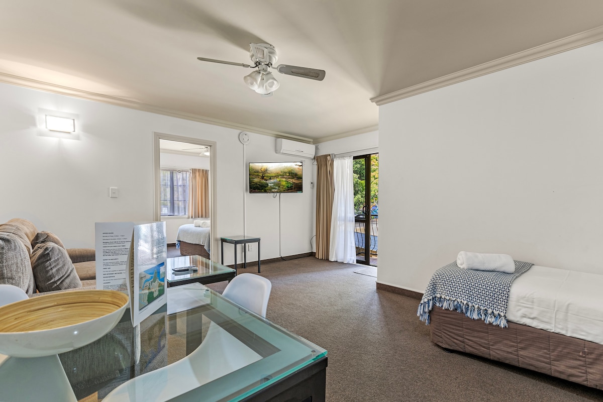 Your 2-bedroom unit has a modern interior with 1 queen bed in room 1, 1 single bed in the lounge and 2 single, built-in bunk beds in room 2. There is a well-equipped kitchenette with microwave, electric fry pan, fridge, jug and toaster. The dining/lounge area is cosy with Freeview TV. You have your own full private bathroom, free WiFi access and free parking space for 1 vehicle outside your unit. Level entry to the unit from the parking area provides easy access and we are close to amenities.