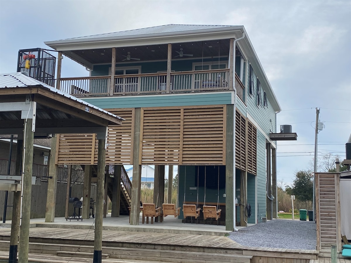 Relax and unwind at Camp Who Dat! The house is perfect for entertaining with a screened porch upstairs, an outdoor kitchen downstairs, a boat dock, and hot tub. The house is a short drive to the gulf coast beaches and downtown and there is a boat launch nearby. The house has an open kitchen and living space with 2 bedrooms, 2 baths, washer/dryer, and high speed internet. The house has an outdoor lift for ADA (by request only). Bring your bikes, kayaks, jet skis, pontoon or bay boat!