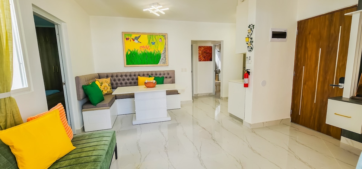 3 minutes walk to the private Beach. Escape to the Tropical Paradise, with a Blue Flag category Beach, Relax, lying under palm trees , walking in the white sand beach, swimming in crystal clear turquoise water and enjoy the most spectacular landscape in Bayahibe, Dominican Republic. Beautiful and cozy, full equipment apartment next to the beach, with two 2 bedrooms with 2 baths, full equipment to accommodate until 6 people. You and your family will enjoy and love this place.
