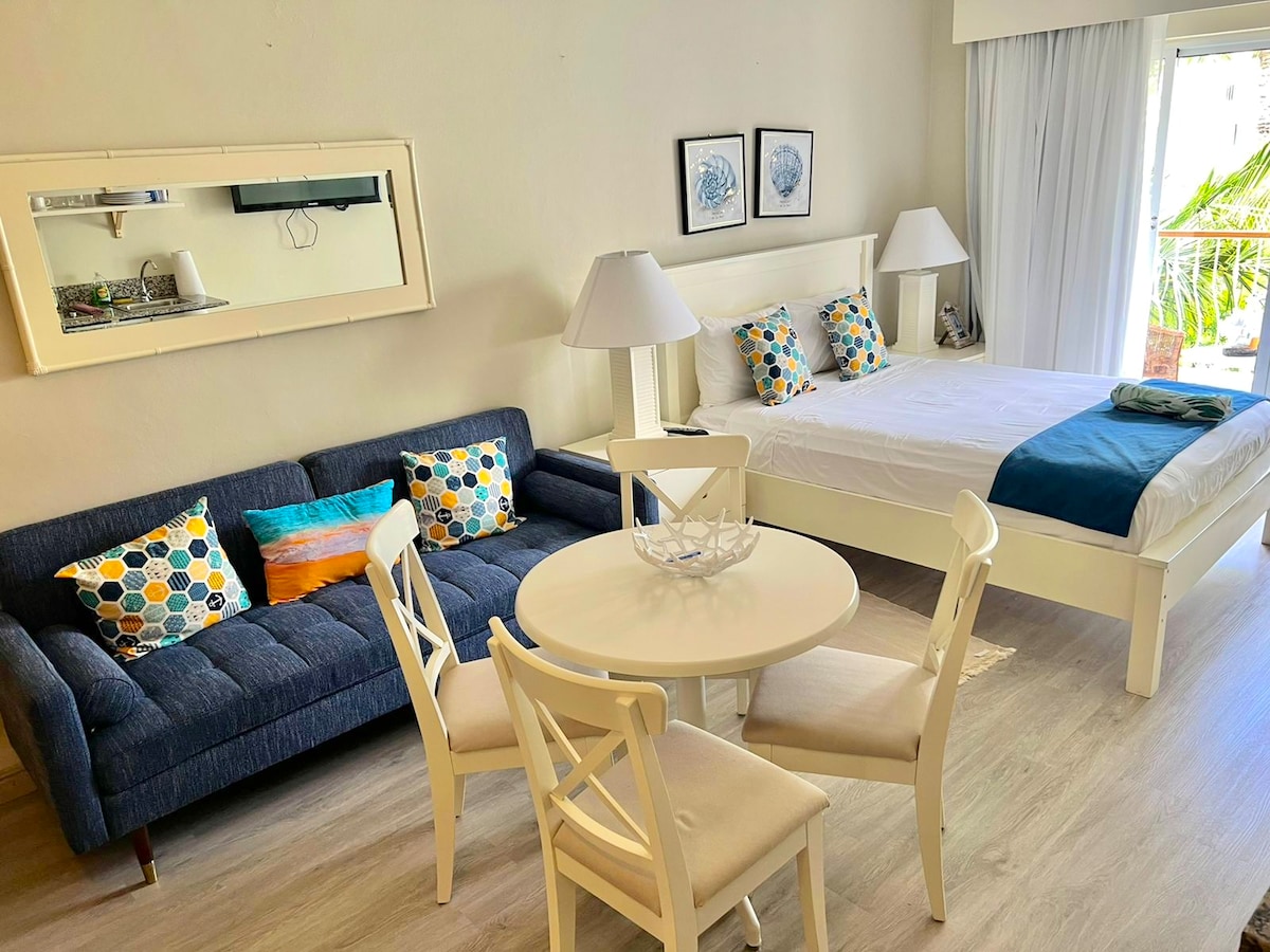 Relájate en este espacio tranquilo y elegante, 2do piso, vista a la piscina, parqueo privado, a 3 min de la playa caminando, la más visitada por turistas, como también excursiones Isla Catalina y Isla Saona, four wheel, Restaurantes Onno¨s entre otros restaurantes a la carta . Un espacio cómodo para disfrutar en pareja, familias con un niño(a), 1 habitación amplia con cama king size y dos sofá cama disponibles, seguridad 24 horas , luz , aire, calentador, dispensador, tv con canales premium.