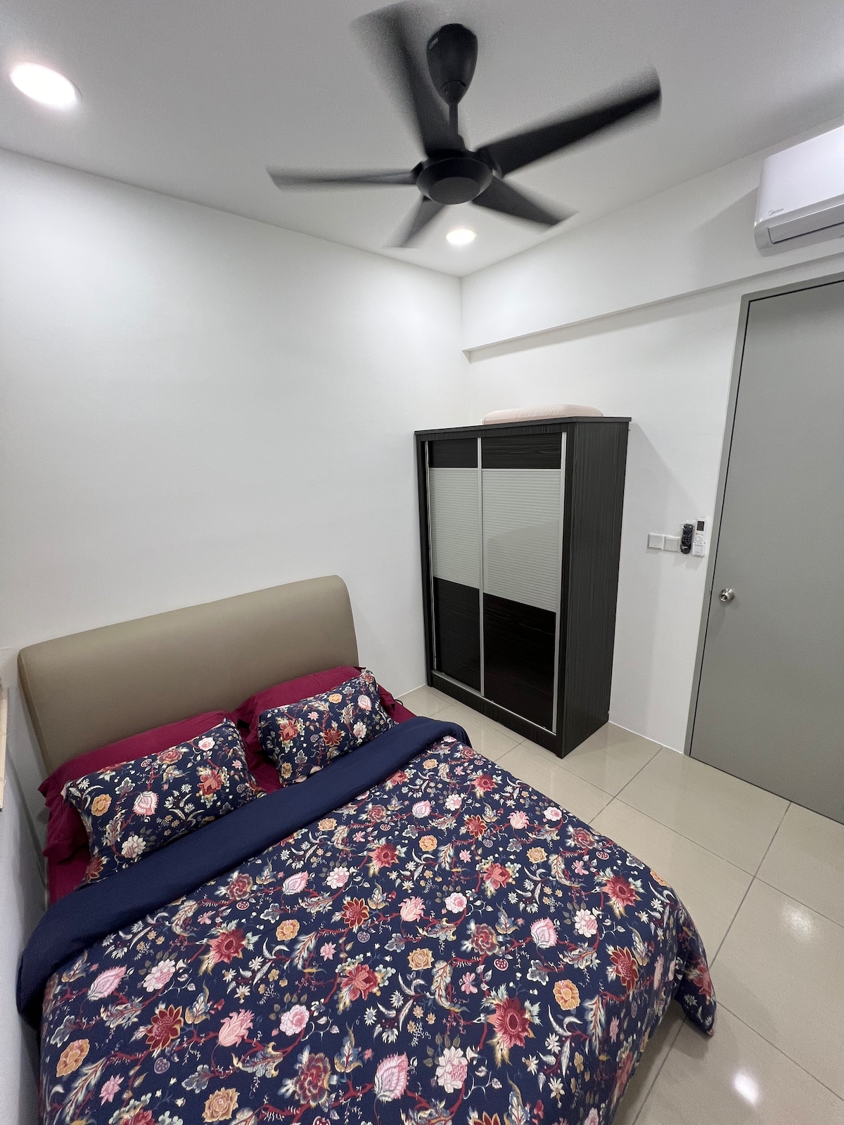 Enjoy a stylish experience ★ 1Queen Size Bed + 1Single Size Bed ★ WiFi TV provided ★ Driving duration: 5min to Queens Bay Mall, 5min to Free trade zone, 5min to Pantai Hospital ★ Free Car Park ★ Easy Check in and Check Out at this centrally-located place.