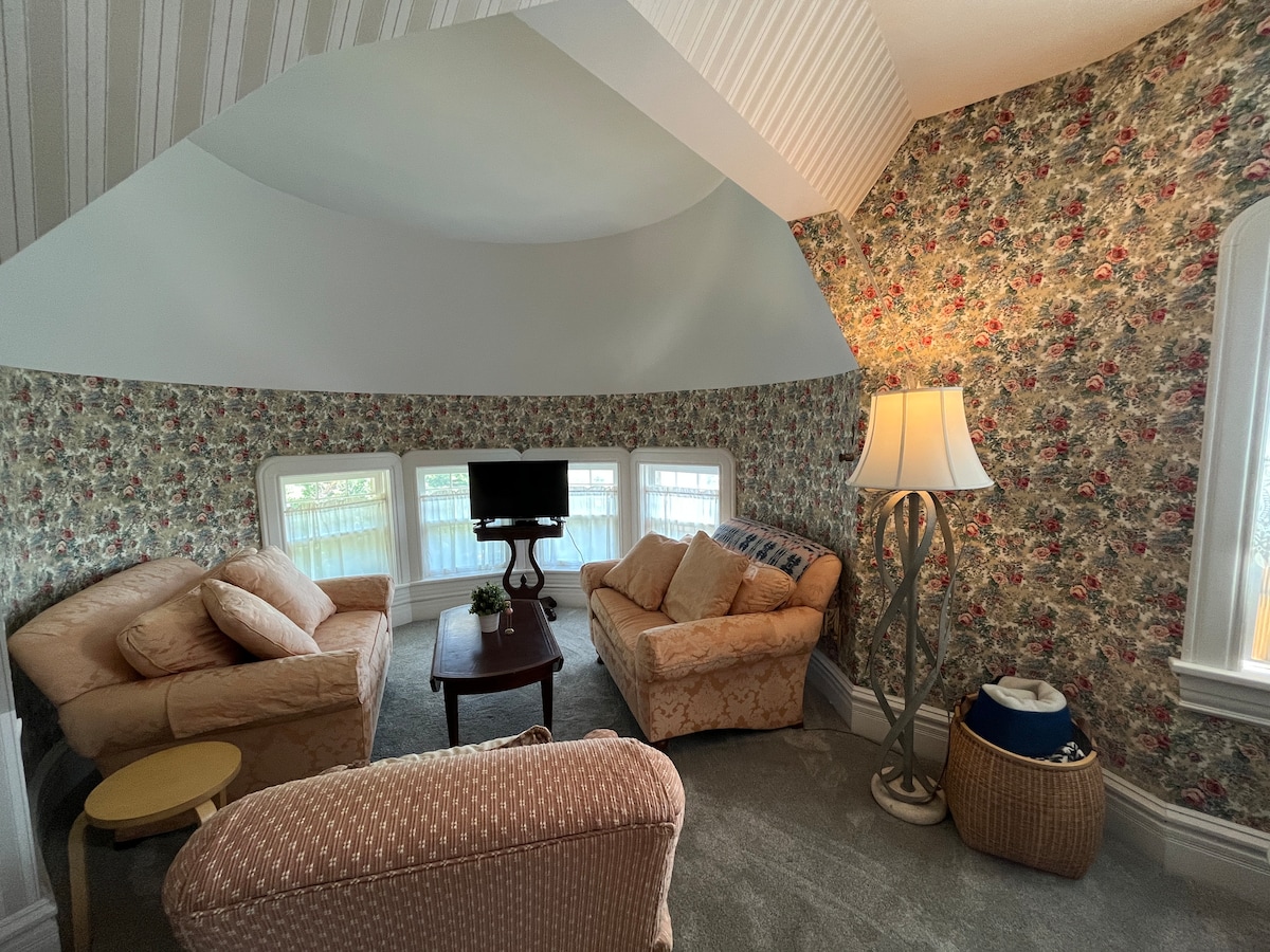 Stay in theQueen's View B&B- Enjoy views of Lake Superior, sauna and plunge pool (all year!), exquisite gardens, wrap-around porch, house made breakfasts, blocks from downtown Bayfield. This second floor suite offers two bedrooms and two bathrooms, semi-private living room, two balconies, and small limited kitchen area. Guests also enjoy shared first floor areas, outdoor, sauna and plunge pool, porch and gardens. center of the action in this one-of-a-kind place.