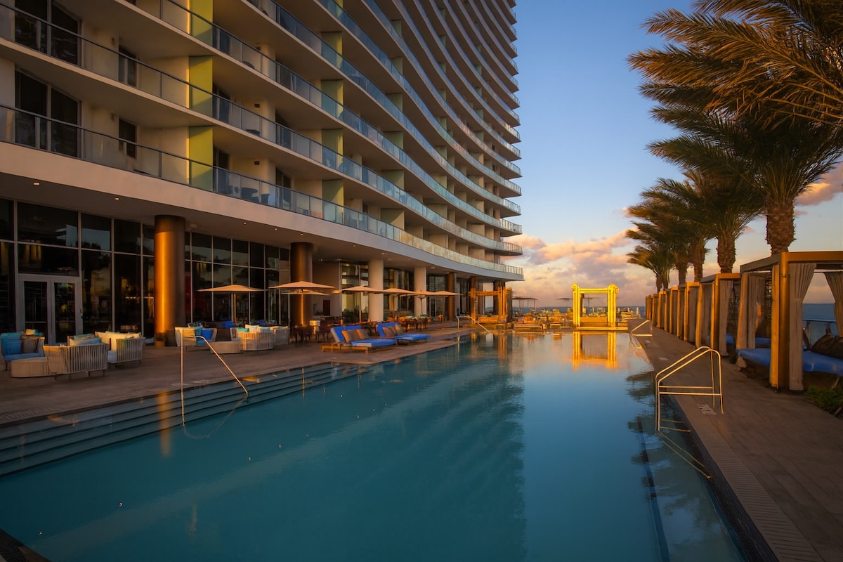 38th-floor oceanfront condo with spectacular nearly 180° panoramic views of the ocean, canal and city skyline. Located in the heart of Hollywood Beach with direct beach access, pool and gym. Great location near 2026 World Cup venues in South Florida. Steps from the famous Broadwalk. Perfect for up to 4 guests looking to combine beach, comfort and a prime location.