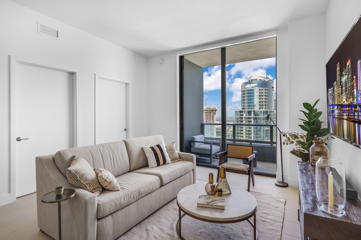 Experience modern luxury on the 50th floor! This newly designed 1BD penthouse offers breathtaking bay and city views through floor-to-ceiling windows that fill the space with natural light. The bedroom features a king-size bed, and the living room includes a comfortable sofa bed, perfect for up to 4 guests. Enjoy a fully equipped kitchen, resort-style pool, gym, and spa. Located in Downtown Miami, just steps from the city’s best dining, shopping, and nightlife.