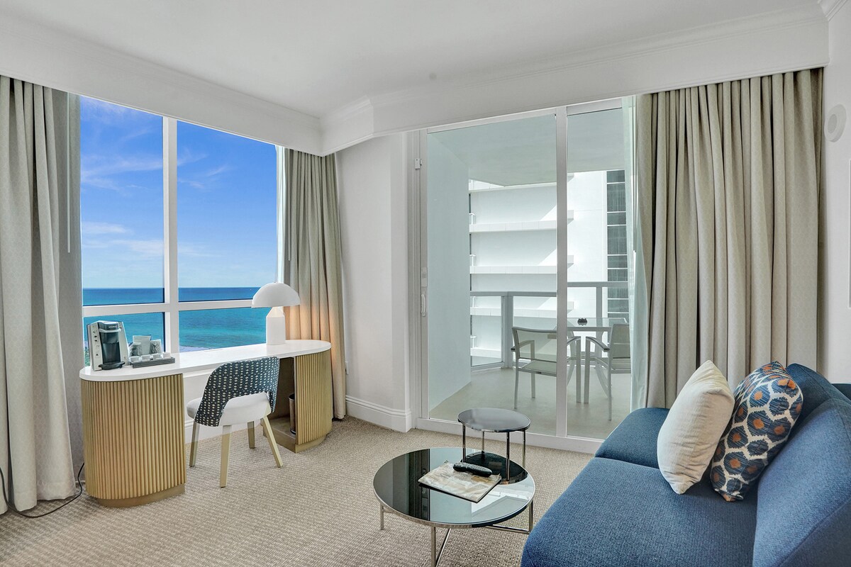 This Junior Suite is located in the iconic Fontainebleau Hotel & Resort. Apt is 500 sq ft (50m2) with breathtaking corner unit ocean views, private balcony, 1 full bathroom with shower & Jacuzzi bathtub. One King Size Bed One Full Size Sofa Sleeper Cot available directly from the hotel for a fee Mandatory Security deposit $250 a night REFUNDED after your stay. Parking NOT included. Daily valet fee may vary see with hotel