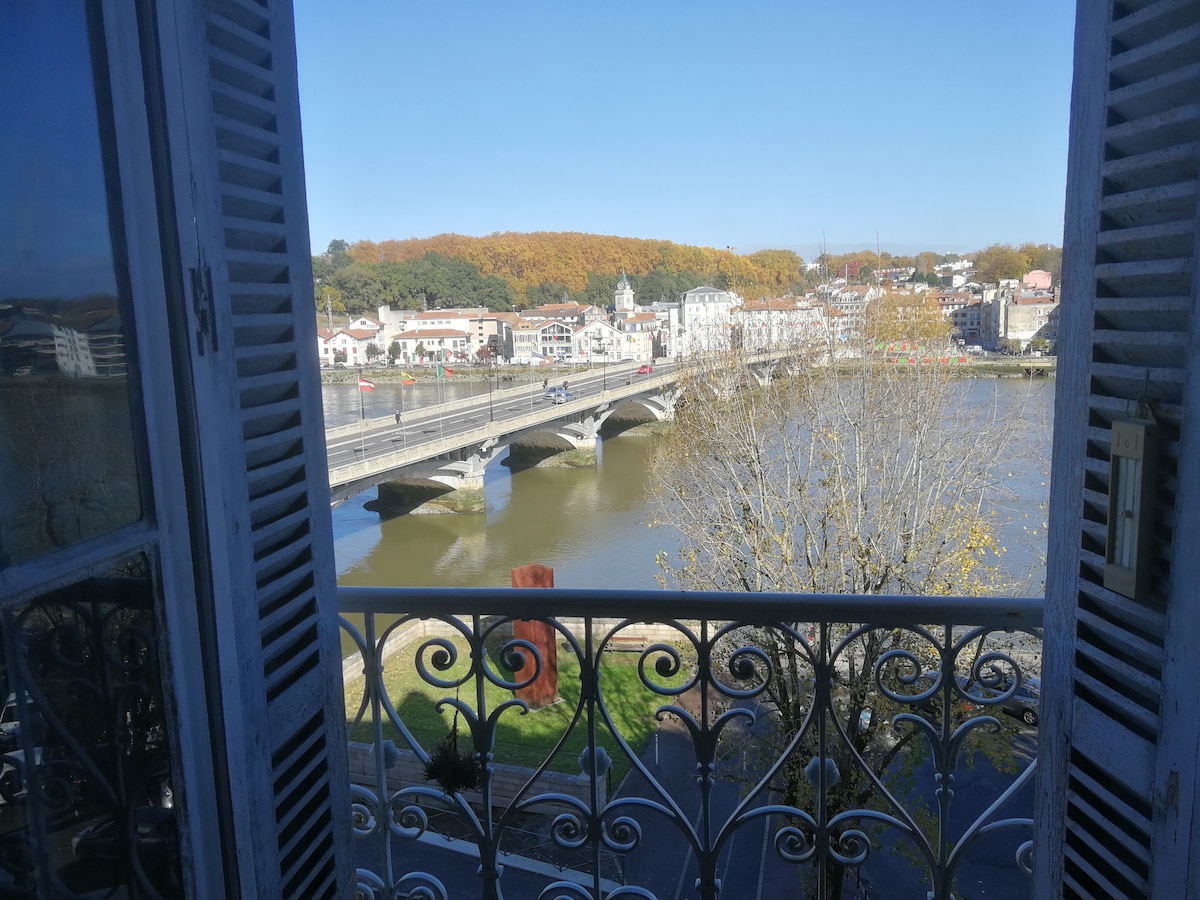 Vous trouverez dans ce spacieux T2 (2 adultes max) tout ce dont vous avez besoin pour passer un agréable séjour. Idéalement placé pour visiter la côte basque, de BIARRITZ à HENDAYE, il est situé à 5 minutes à pied de la gare de BAYONNE et 8Km de l'aéroport de BIARRTIZ pour connaître les disponibilités,appelez nous. une vue magnifique et imprenable sur l'Adour, exposé plein sud vous pourrez apprécier le paysage, vue sur la Rhune.