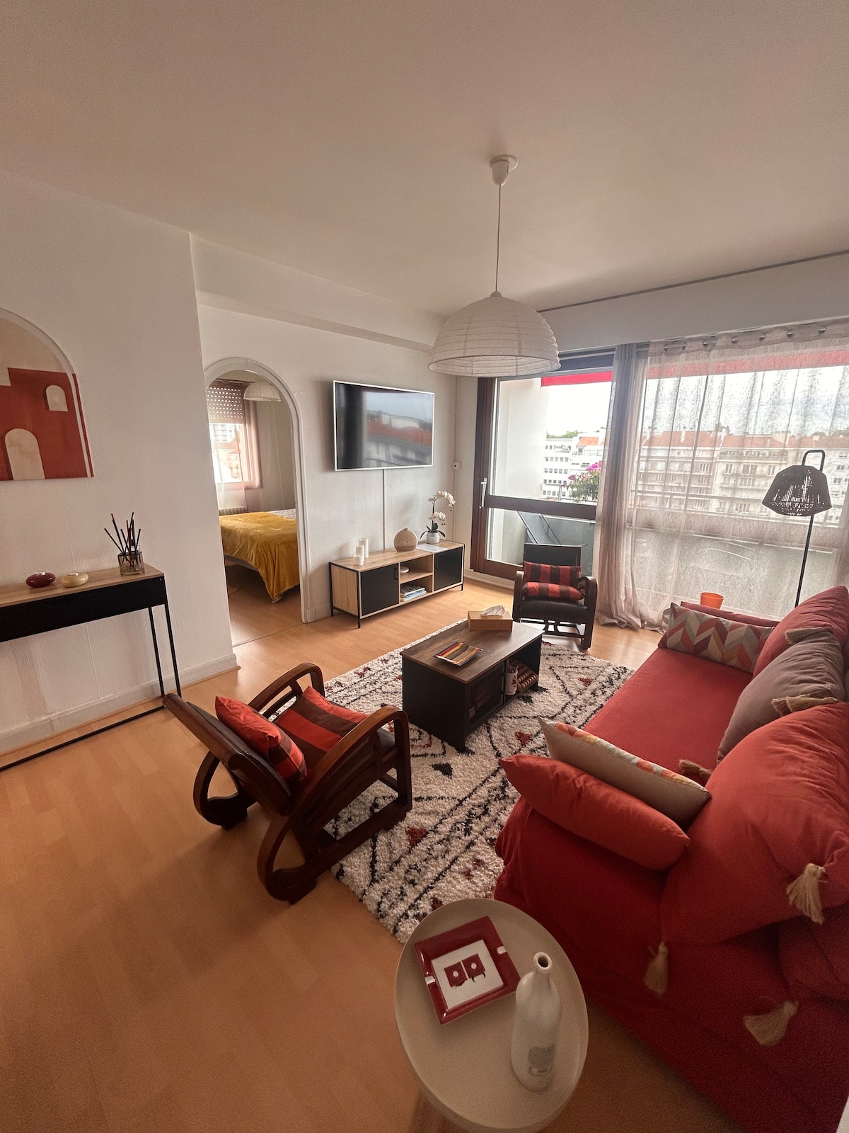 Beautiful 42m2 one-bedroom apartment fully renovated by an architect. Modern, comfortable and bright with large 15 m2 terrace west/southwest facing. Fully equipped and ideally located (beaches, golf courses, Biarritz, Bayonne...) to enjoy the Basque coast and its land, as a couple or family. People traveling for work are also welcome.