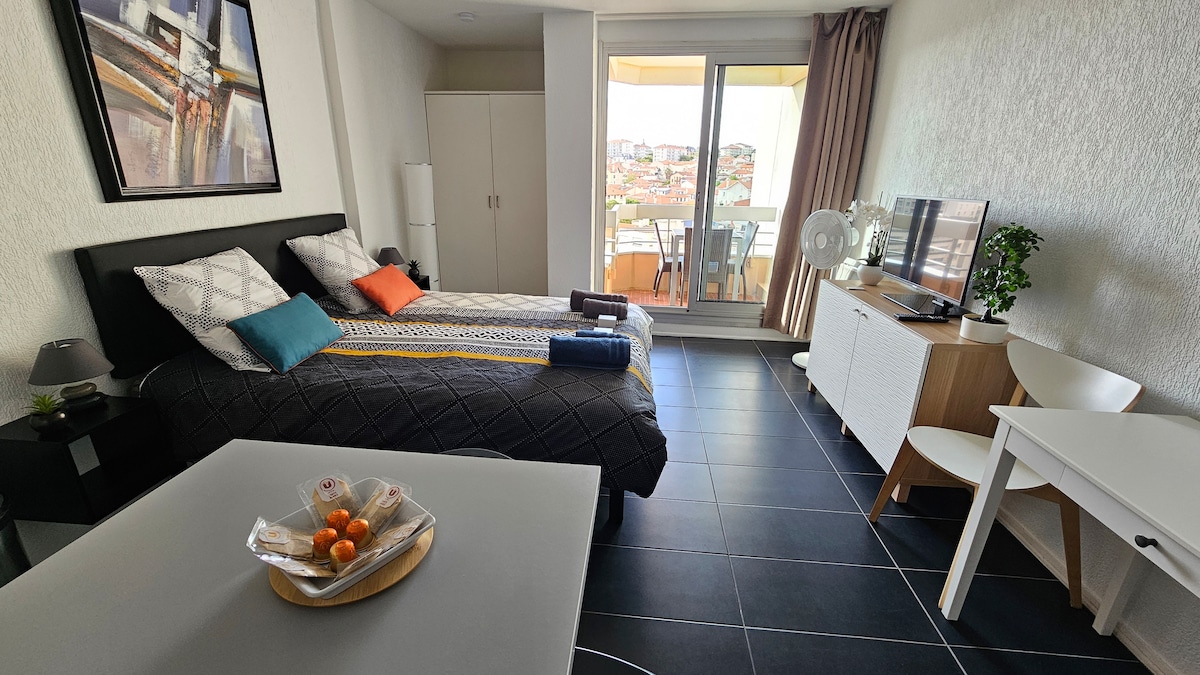 Magnifique appartement de 27 m2 situé au dixième étage de la célèbre résidence VICTORIA SURF, vue panoramique sur la ville, de la terrasse, pour profiter au maximum du lever du soleil et des repas, accès direct à la grande plage de BIARRITZ, ainsi qu'à la piscine de la résidence (de Juin à Septembre). Le studio est composé d'un lit de 160x200, espace cuisine, salle d'eau, un WC indépendant, rangements, ainsi qu'un espace de travail dédié. Le ménage ainsi que le linge de maison est compris.