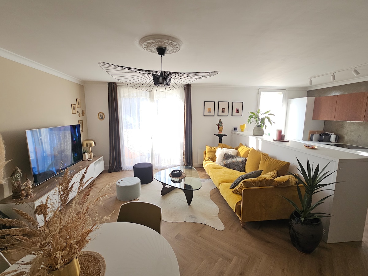 Venez profiter de l'esprit nature, et de l'ambiance cosy de notre appartement. Idéal pour 2 adultes et deux enfants ou 4 voyageurs. L'appartement en duplex, possède une terrasse privative au sein d'un espace extérieur commun à deux appartements. Très central, il est à 8 mn en voiture des plages, et au coeur du centre ville avec toutes les commodités accessibles directement à pieds. Une navette à destination de la plage est située directement au pied de l'appartement.