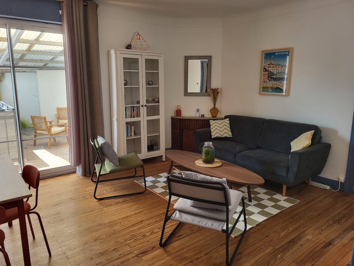 Appartement entièrement rénové rez-de chaussée d'une maison basque. À 4 mn du cœur de Bayonne, à 10 mn des plages et 20 mn de l'Espagne. À 7 mn de l'autoroute, 10 mn de l'aéroport. A proximité des arrêts de bus pour se déplacer facilement ! Grand T2 de 40 m2 lumineux aménagé avec soin et sa grande terrasse privative équipée. La chambre est dotée d'un lit 160x200. Dans le salon : un convertible de haute qualité 160x200. Stationnement aisé devant la maison.