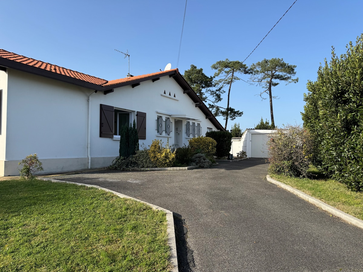 Maison avec jardin au calme de la pinède, directement sur le golf et à 2 pas de la plage (plage à pied en 10min) avec parking privé composée : - d'un salon avec cuisine équipée ouverte, - un jardinet privatif - une chambre indépendante avec un lit 2 personnes - une mezzanine mansardée avec 2 lits d'une personne - une salle de bain avec douche - un WC indépendant Plage à pied Ligne de bus à proximité desservant Bayonne, Biarritz, Saint Jean de Luz,,Aéroport à 15min en voiture,