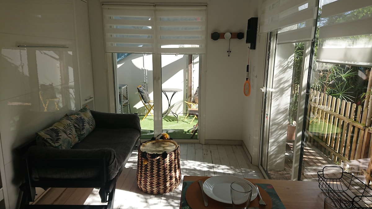 Located in the garden of my home, you access through the garden to this pretty house, 19 m2, in a green setting, with a private furnished terrace, sunny and in complete privacy. It's just one room, it's small, cozy, comfortable and functional, everything is there! Murphy bed, bathroom with walk-in shower and toilet. Reversible air conditioning. Rolling shutters on all windows. In the fridge and cupboards you will find breakfast and basic products